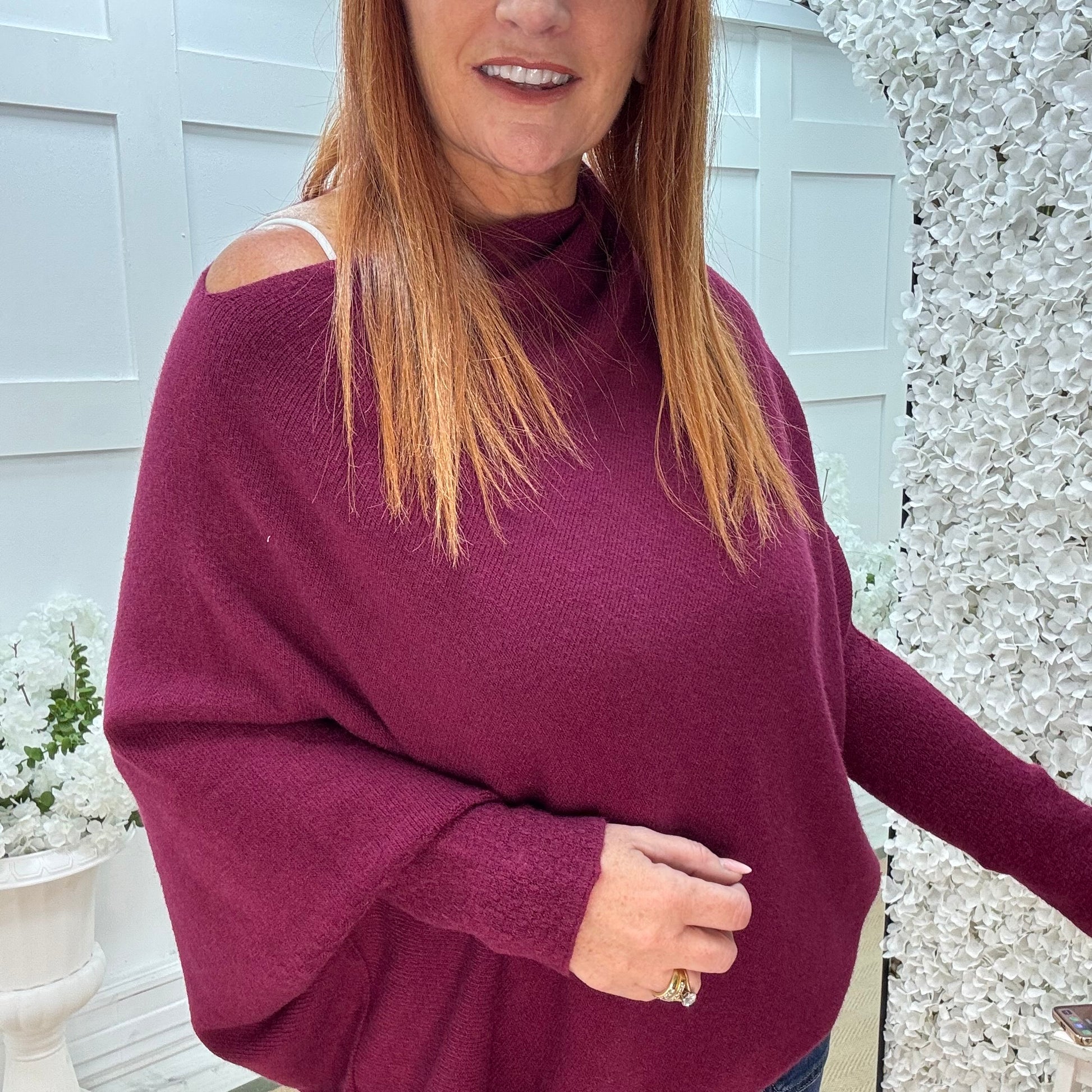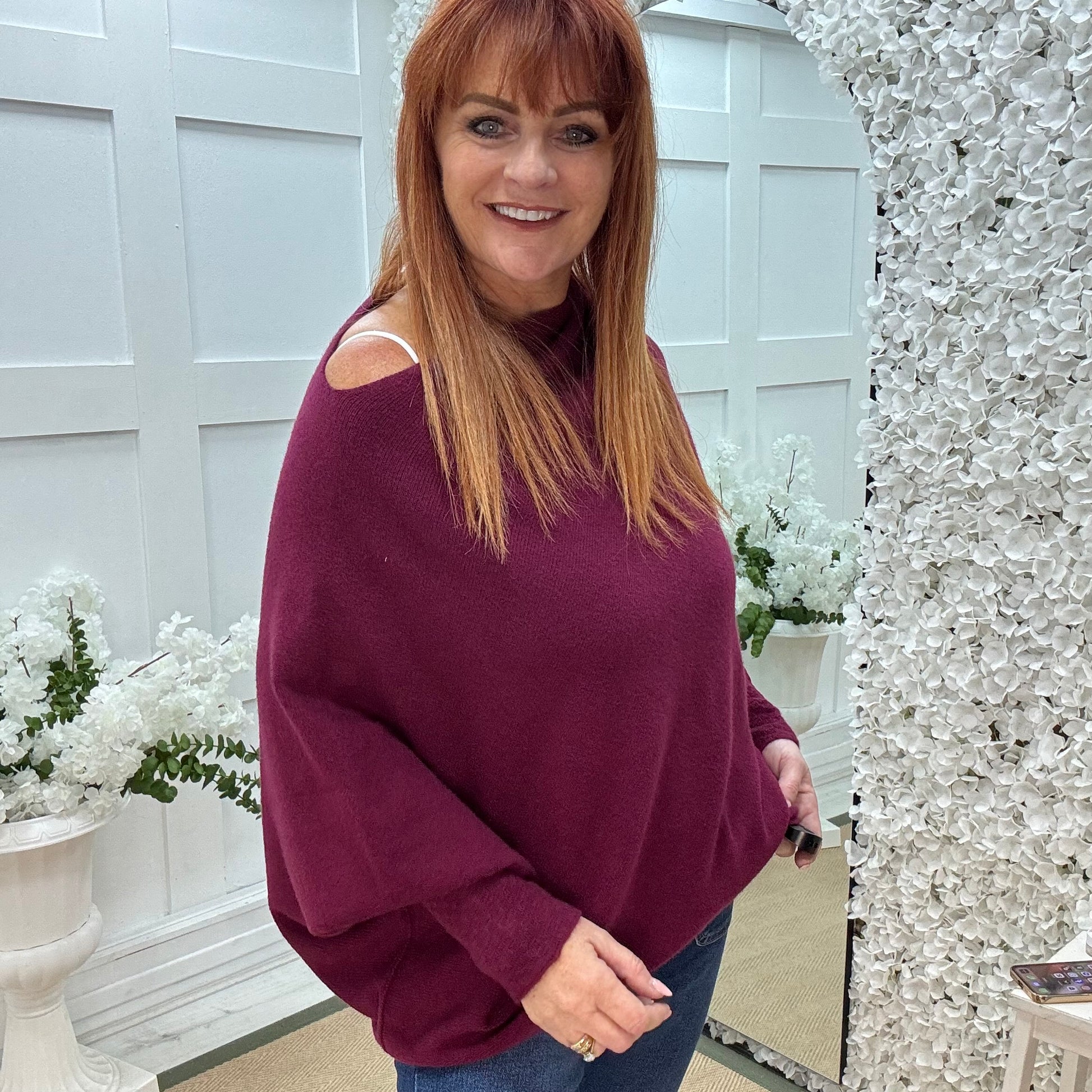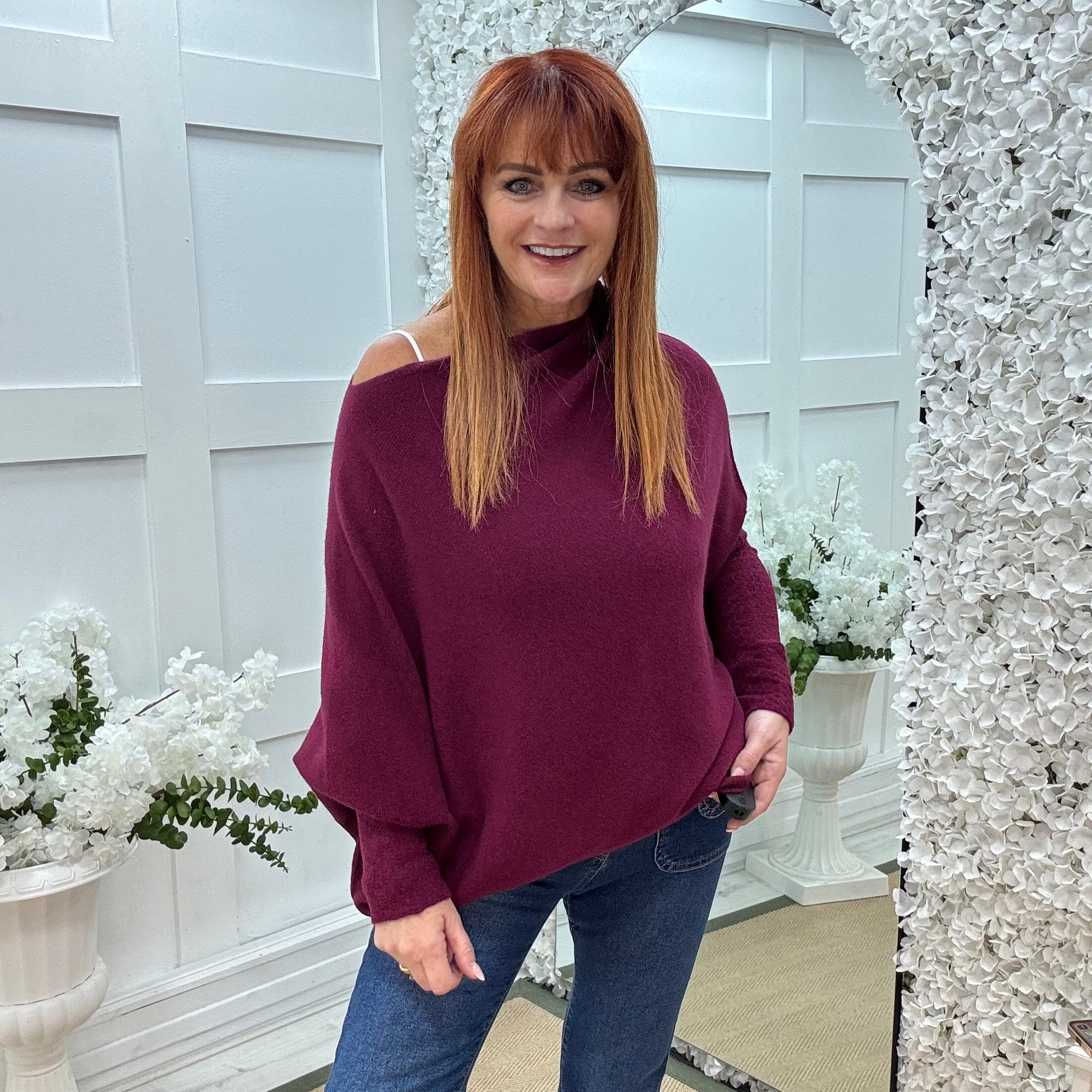 Erica: Burgundy asymmetrical slouch soft knit top. One size 10-18