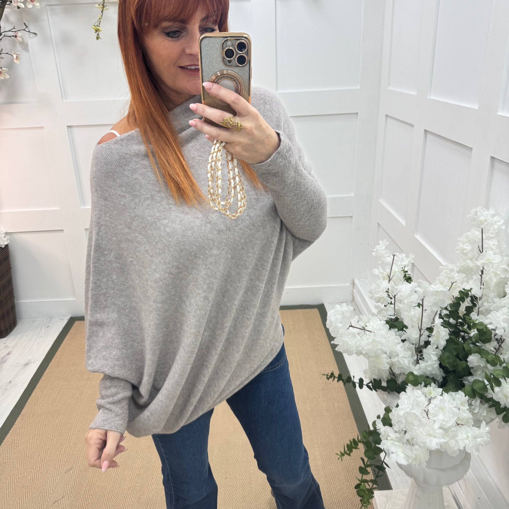 Erica: Oatmeal/beige asymmetrical slouch soft knit top. One size 10-18