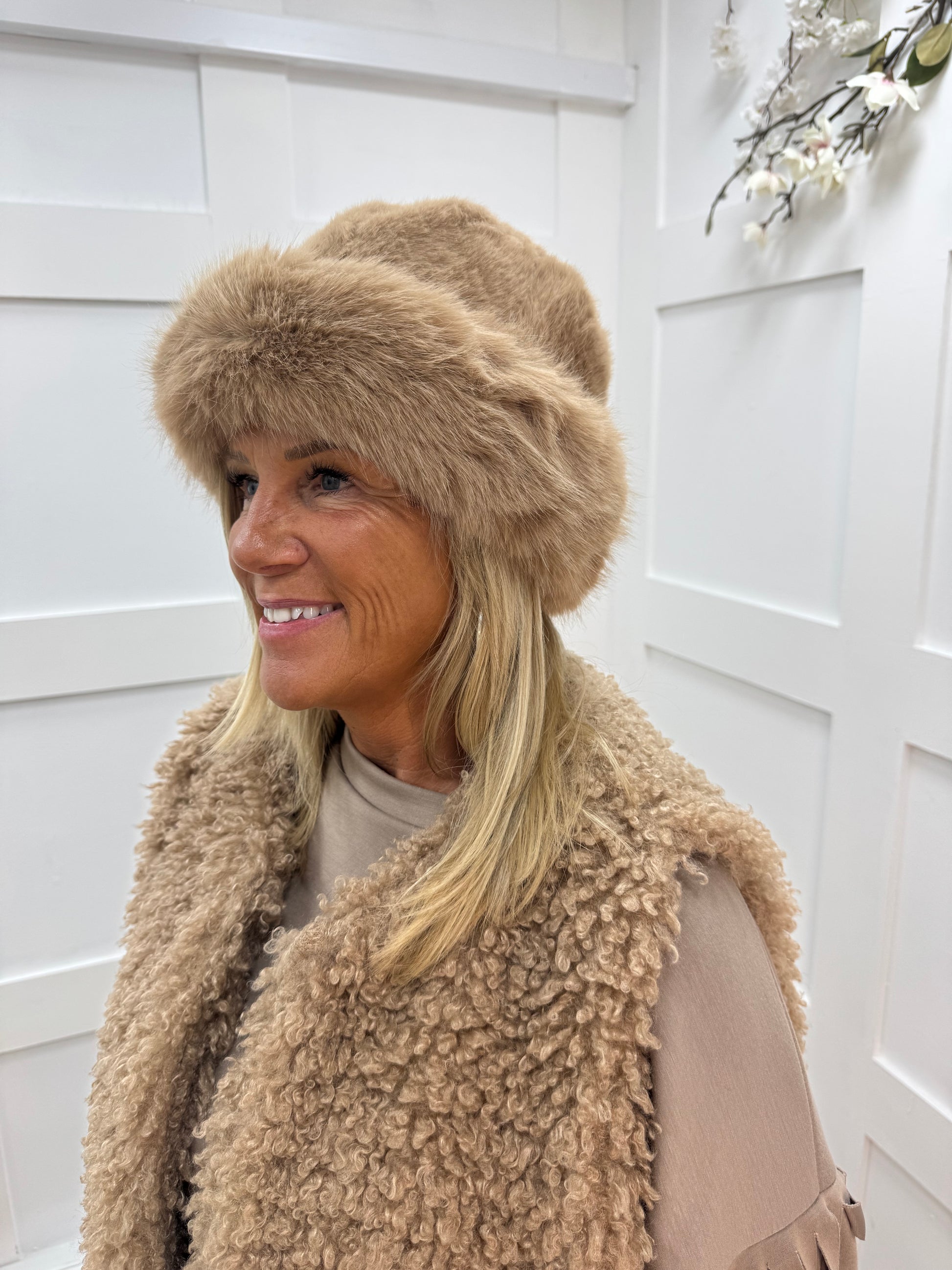 This is a plush camel faux-fur bucket hat with a soft, fluffy texture and a rich, glossy finish. It features a rounded crown and gently flared brim, giving it a cozy yet stylish winter look. Bold and luxurious, it adds warmth and a statement touch to any outfit.