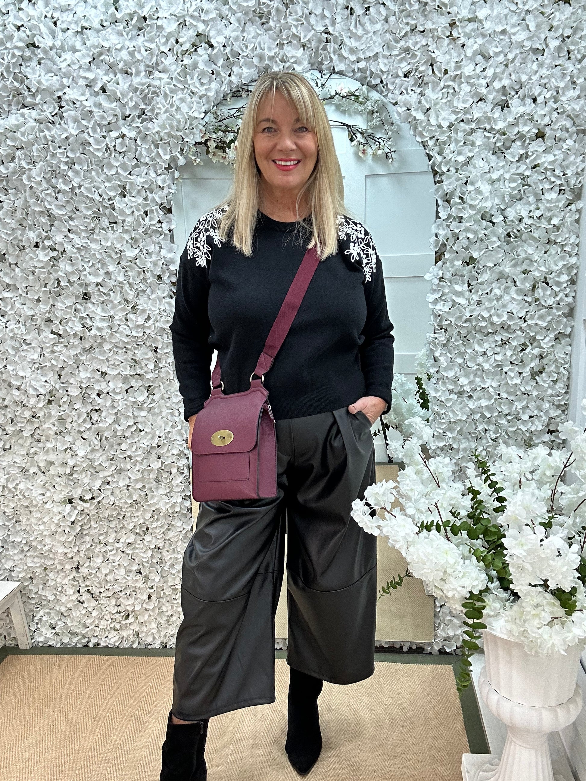 This rich black soft wool knitted top is a mid weight, a great layer perfect for the cooler weather. It features a gentle fit, round neck & stunning embroidered flower detail across the shoulders. Ideal for wearing with leather trousers or jeans, it effortlessly adds a chic touch to any outfit.