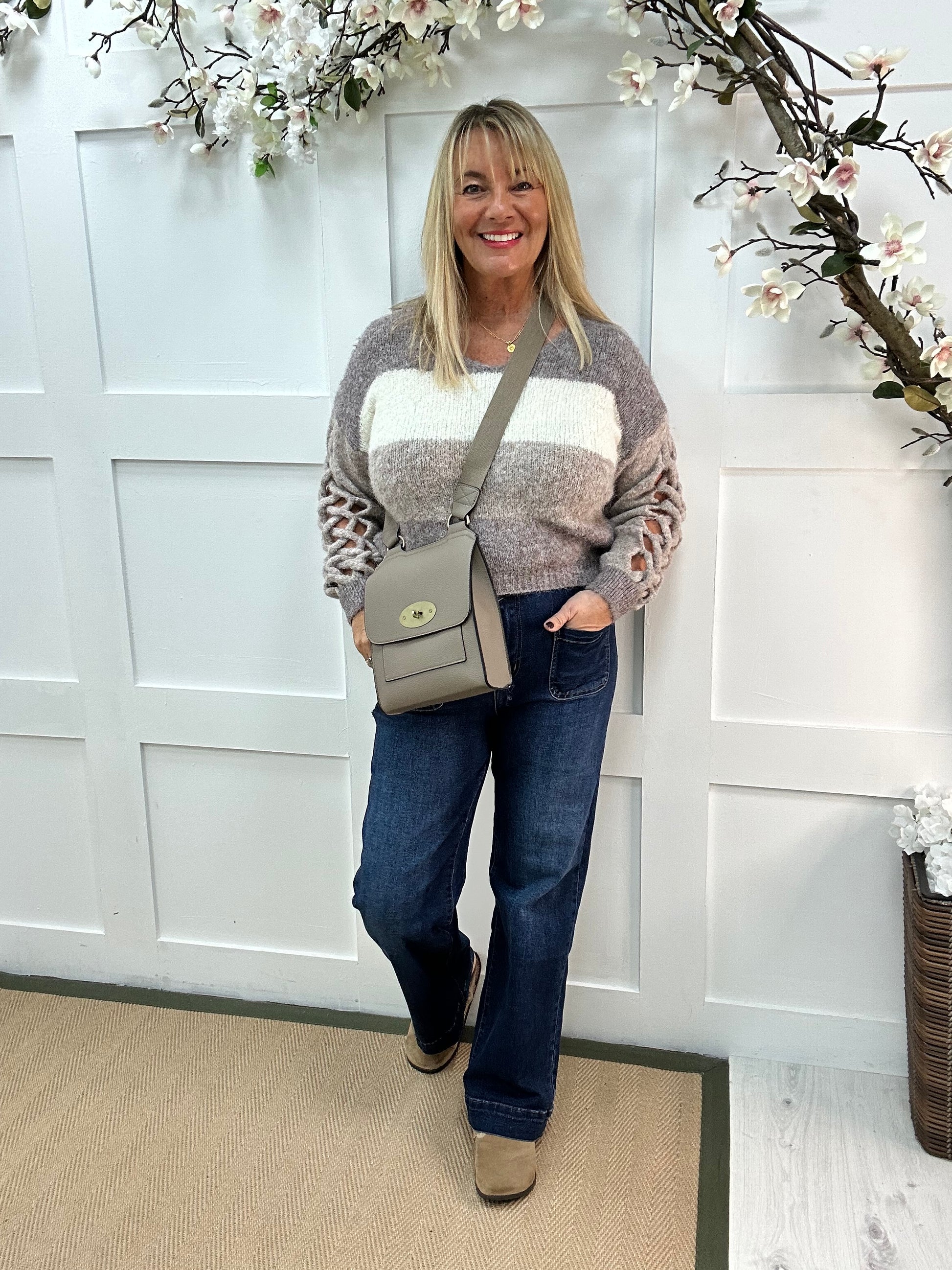 This relaxed fit striped knit features a flattering neckline and long lattice cut sleeves. Its mocha base is highlighted by a gentle cream and beige stripe creating a stylish contrast. Falling loosely over the hips, it offers effortless comfort and chic for everyday wear. Can be paired with our Trudy trousers.