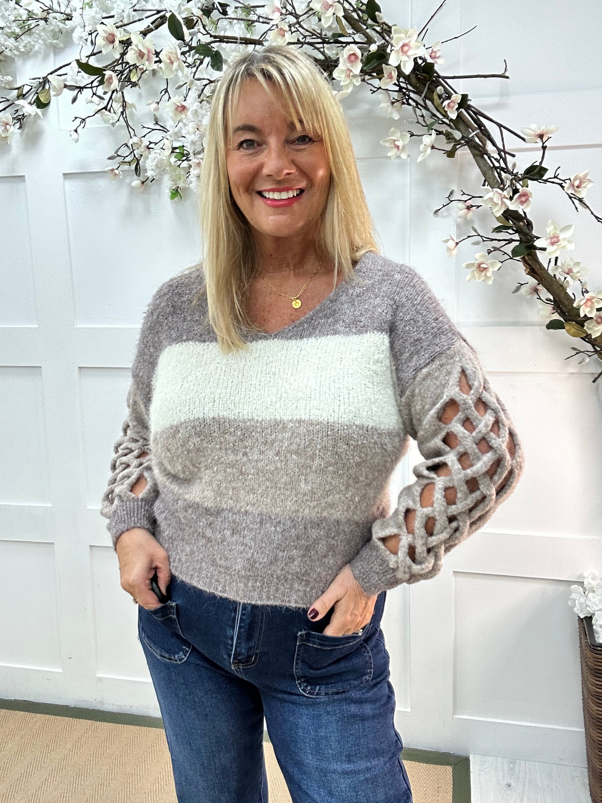 Florri: Mocha stripe lattice-sleeve knit. One size 12-18