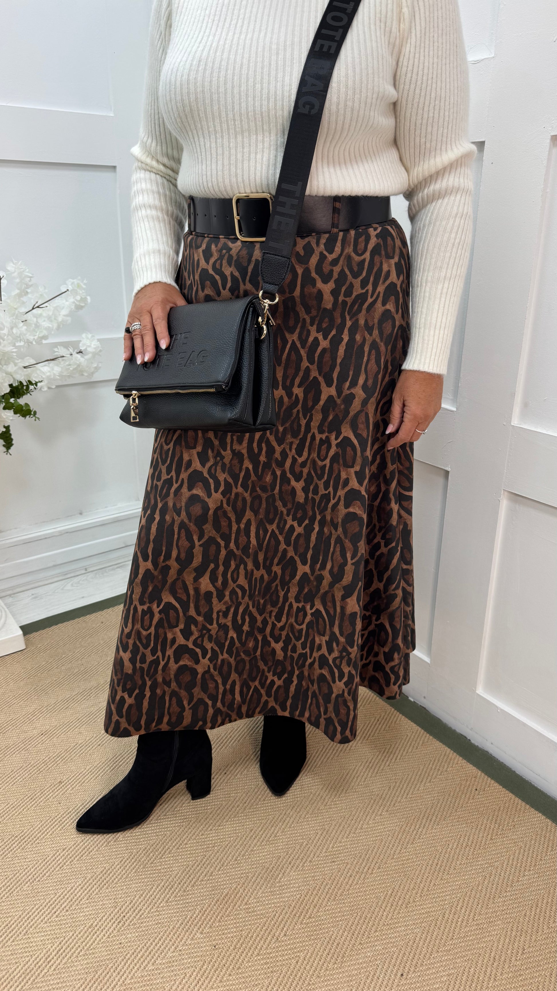 This stretchy belted skirt features an A line shape with a bold leopard print pattern. The soft, flexible fabric offers all-day comfort while maintaining a luxurious look. Perfect for dressing up or down, it moves with you effortlessly, ideal for work, weekends, or stylish everyday wear, team up with one of our Bessie tops for a great look.