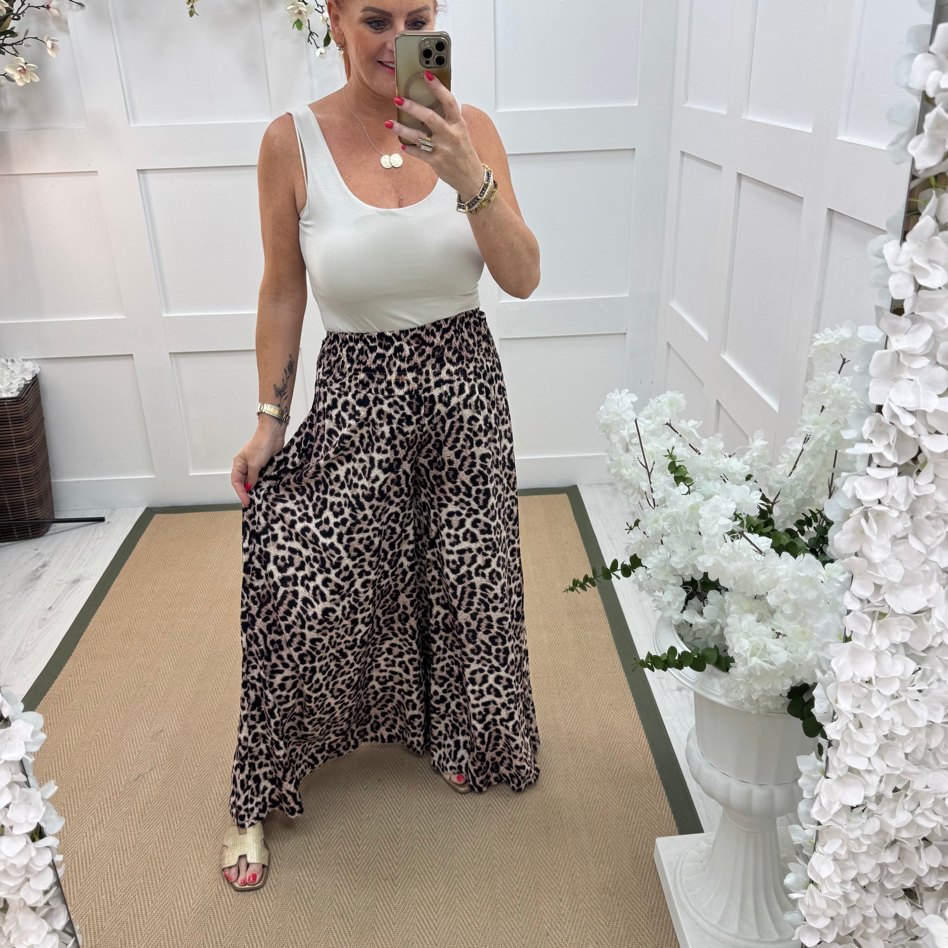 Frankie: Dark leopard print palazzo trousers. One Sz: 10-18