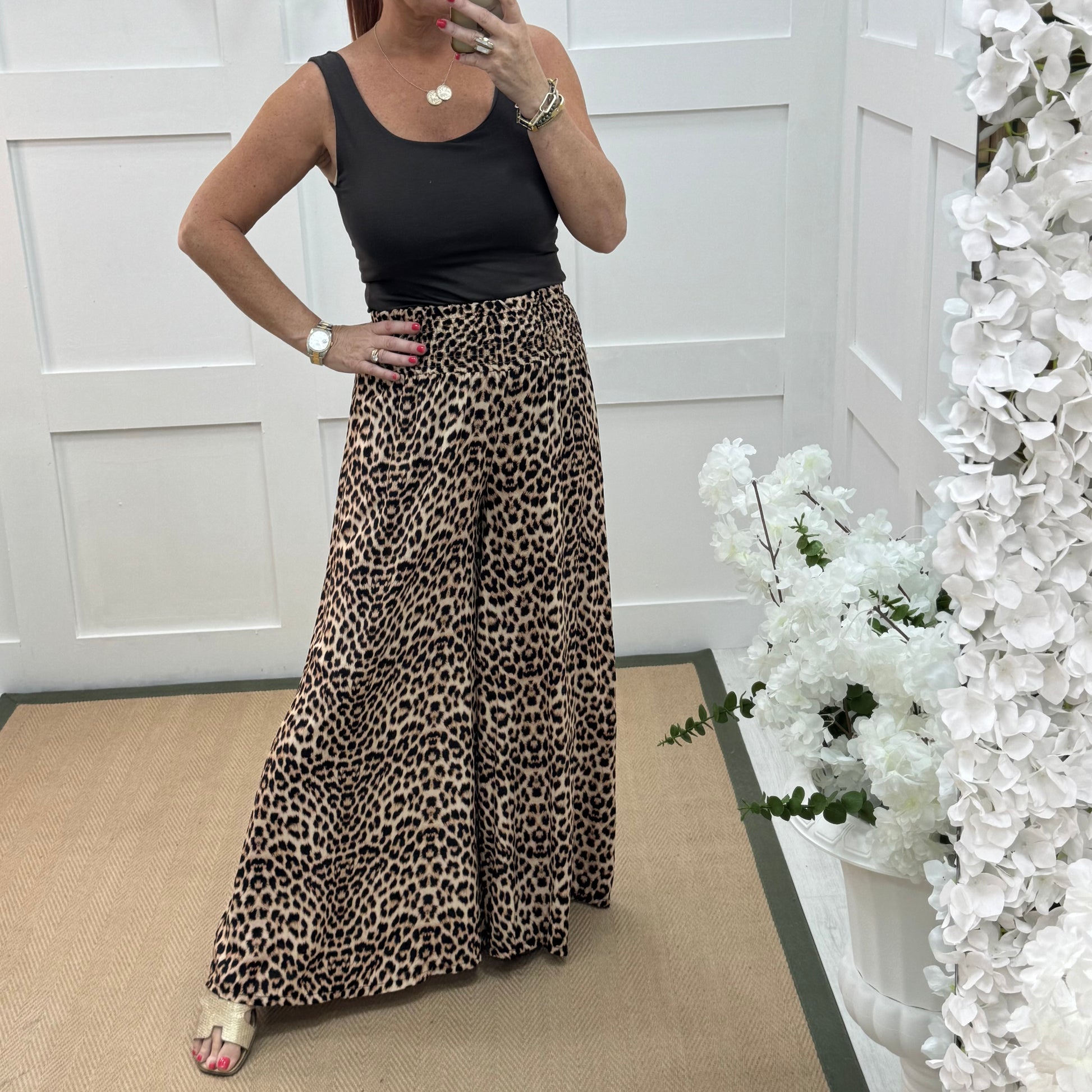 Frankie: Pale leopard print palazzo trousers. One Sz: 10-18
