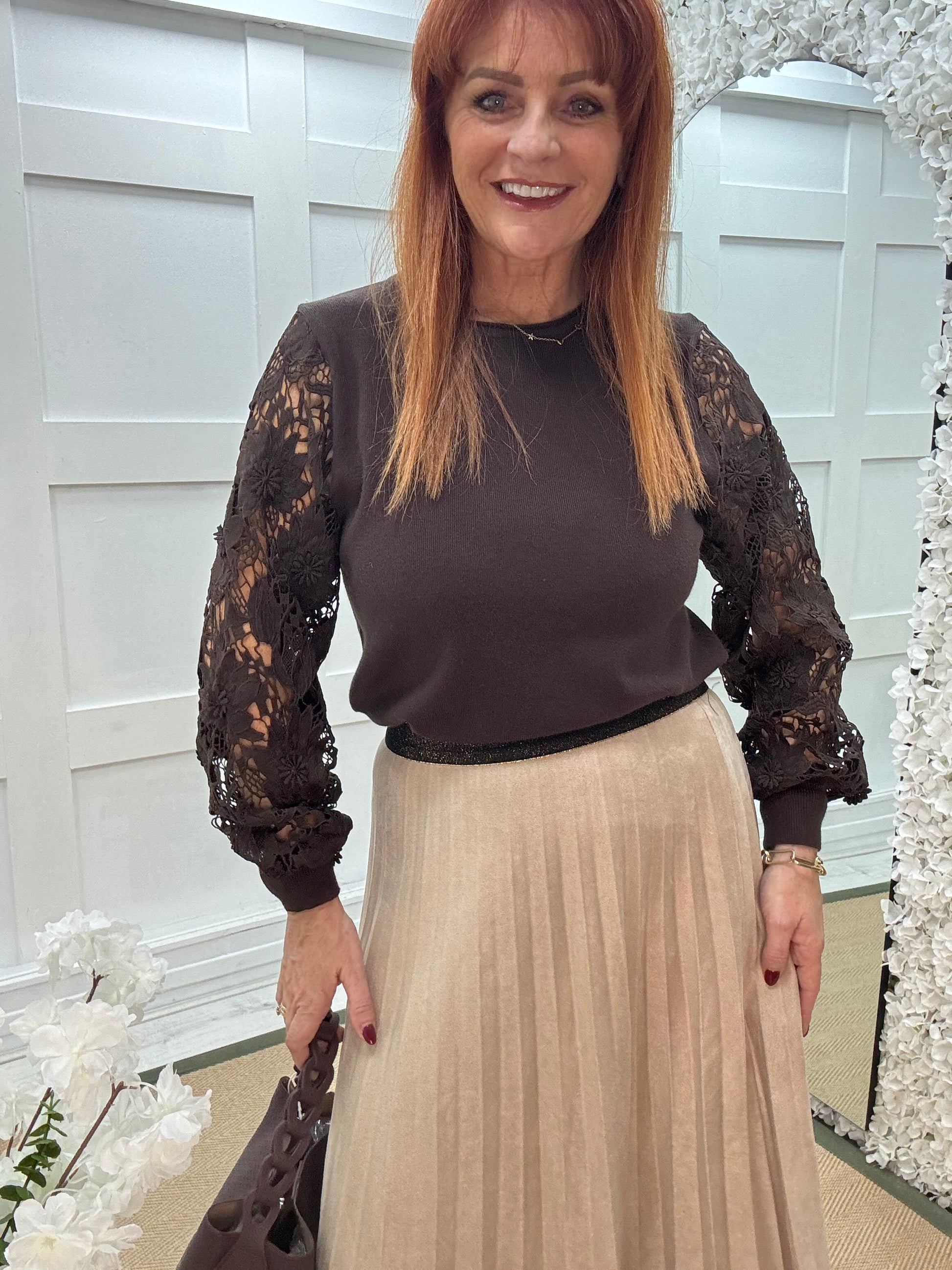 Gemma: Brown crochet balloon sleeve top. One size 12-16