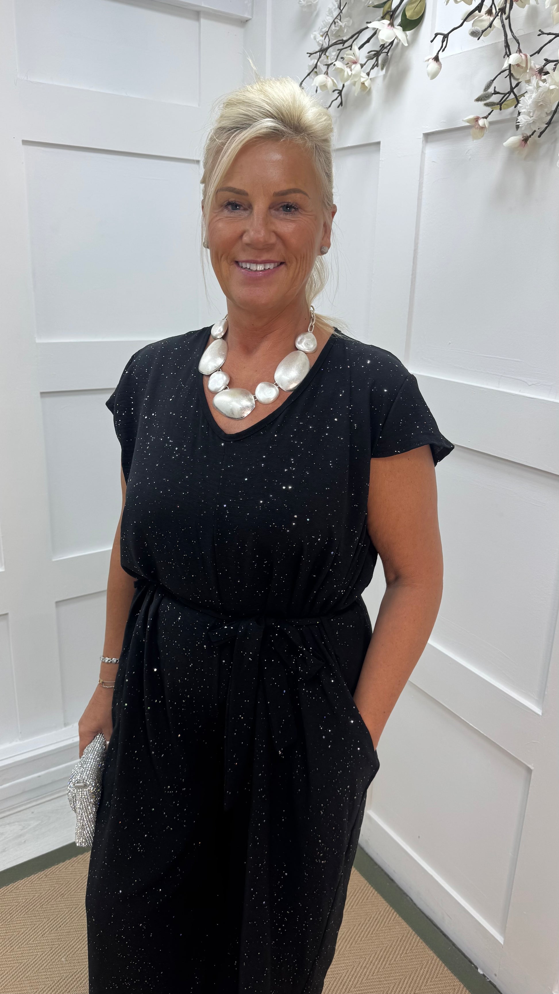 Gia: Black sparkle tie-waist wide leg jumpsuit. One size: 12-18