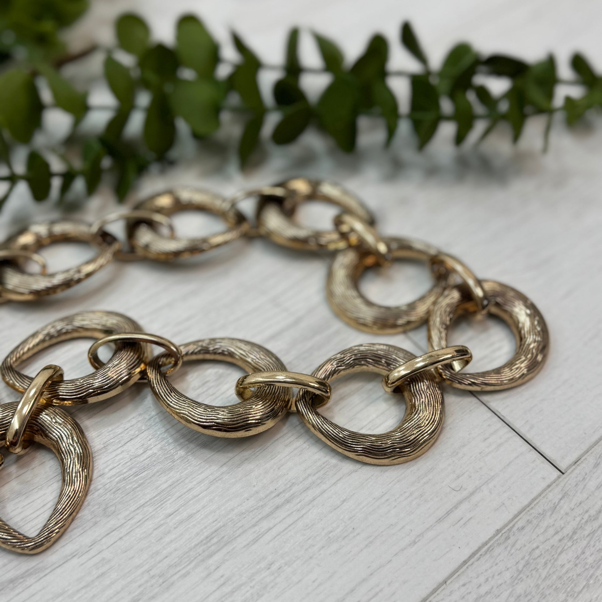 This elegant gold-tone metal belt features interlinked, textured open links with a wavy, organic shape. The brushed finish creates a subtle shimmer, adding depth and sophistication. Adjustable with a matching chain and lobster clasp closure, it’s a versatile accessory perfect for cinching dresses, tops, or coats with a bold, stylish statement.