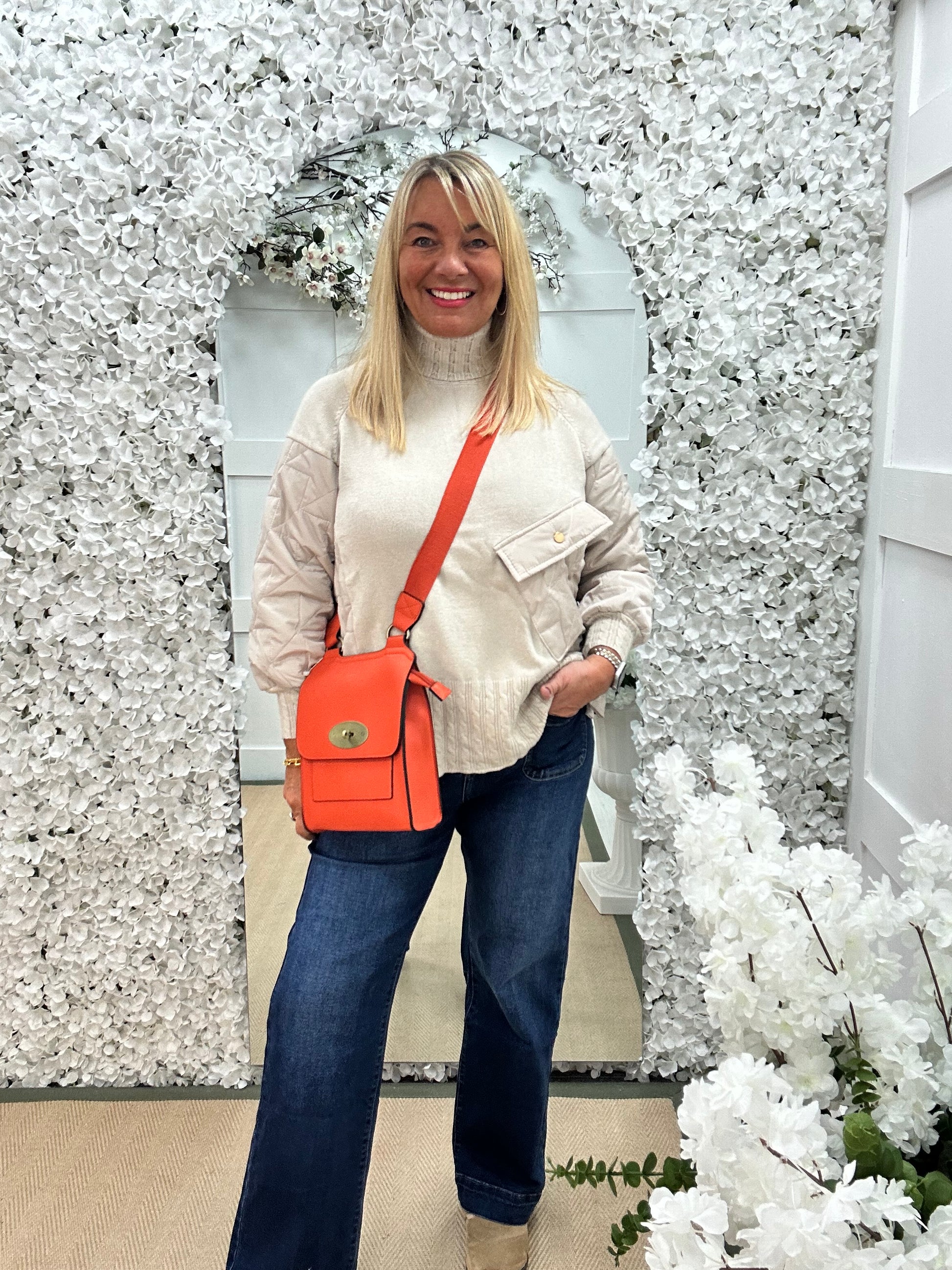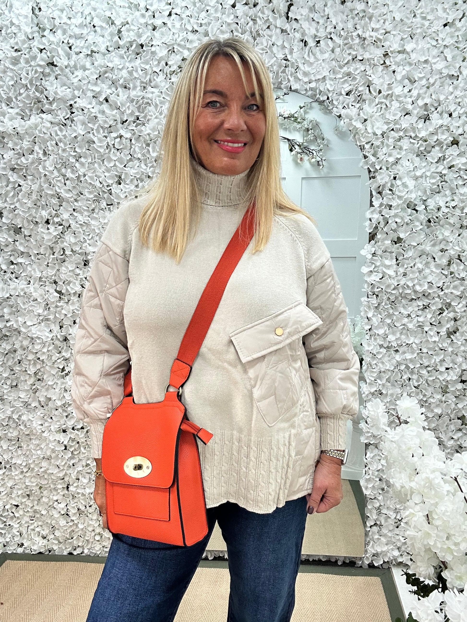 This stretchy knit jumper is effortlessly chic with its soft beige fabric and relaxed fit. Featuring a unique blend of quilting & knit, it blends comfort with understated elegance. Perfect for pairing with leggings or jeans, it’s a versatile piece for both casual and dressy looks.