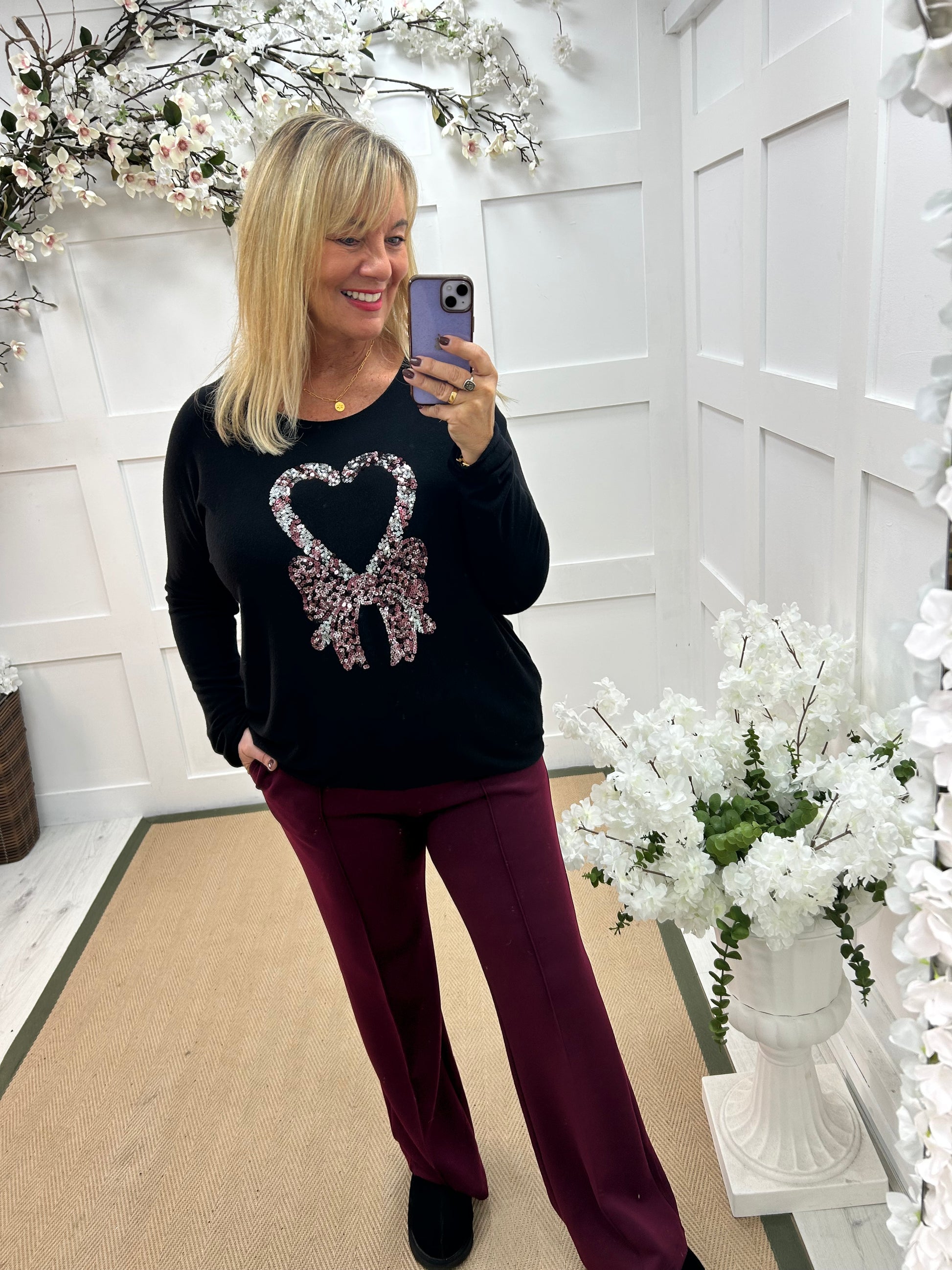 Chic and sparkly, the sequin heart shape high-low top adds effortless charm to any look. This black relaxed-fit top features a shimmering sequin heart design with a bow detail for a feminine touch. Crafted from soft viscose, elastane, and nylon, it drapes beautifully with a flattering longer back and shorter front hem. Perfectly paired with our Erin leggings.