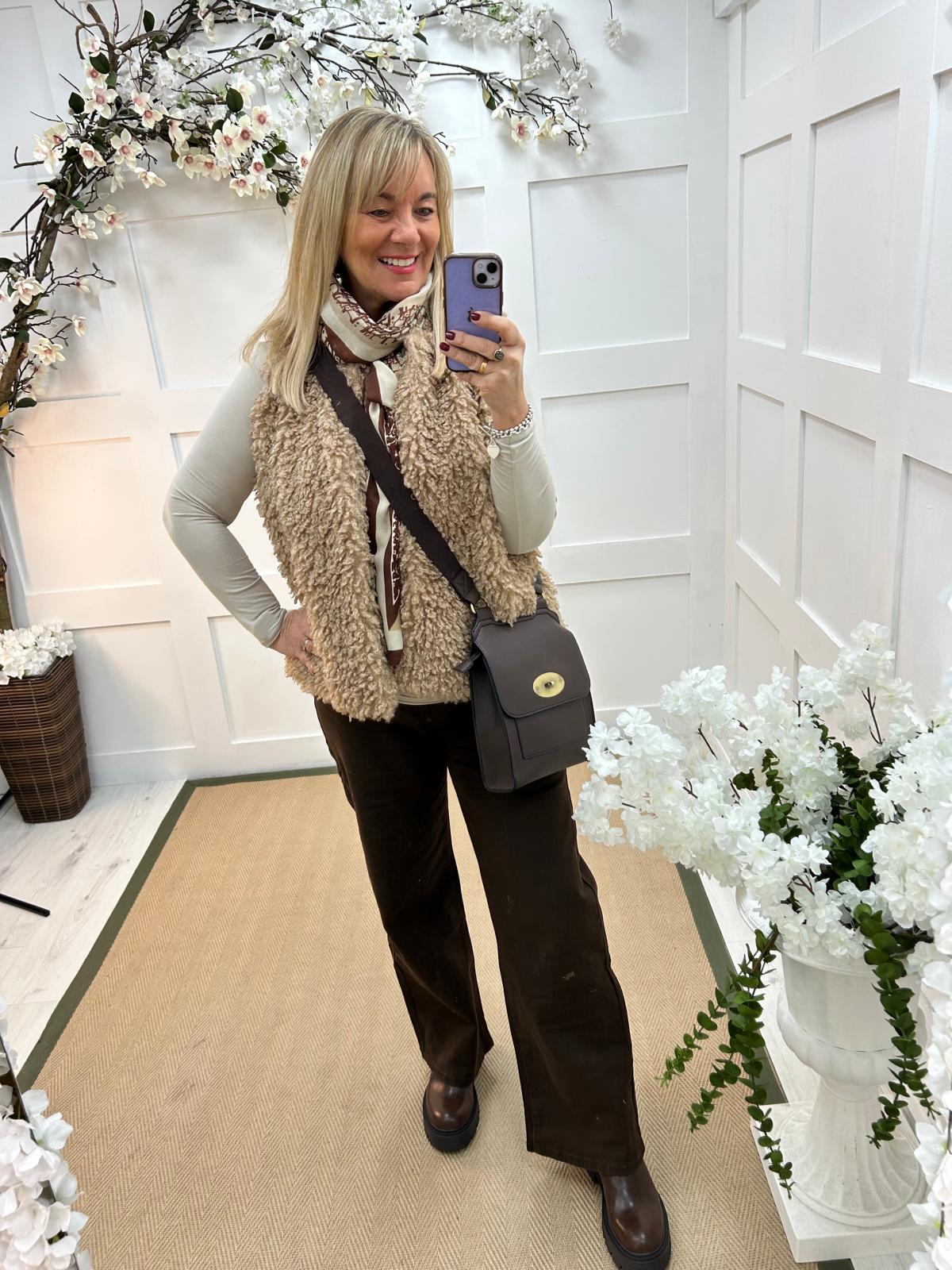 This teddy bear gilet is the perfect blend of cozy and chic. Featuring a soft, plush texture in a camel tone, it adds instant luxury to any outfit. The hook and eye design fastening make it both stylish and practical, ideal for layering over knits on cool days.