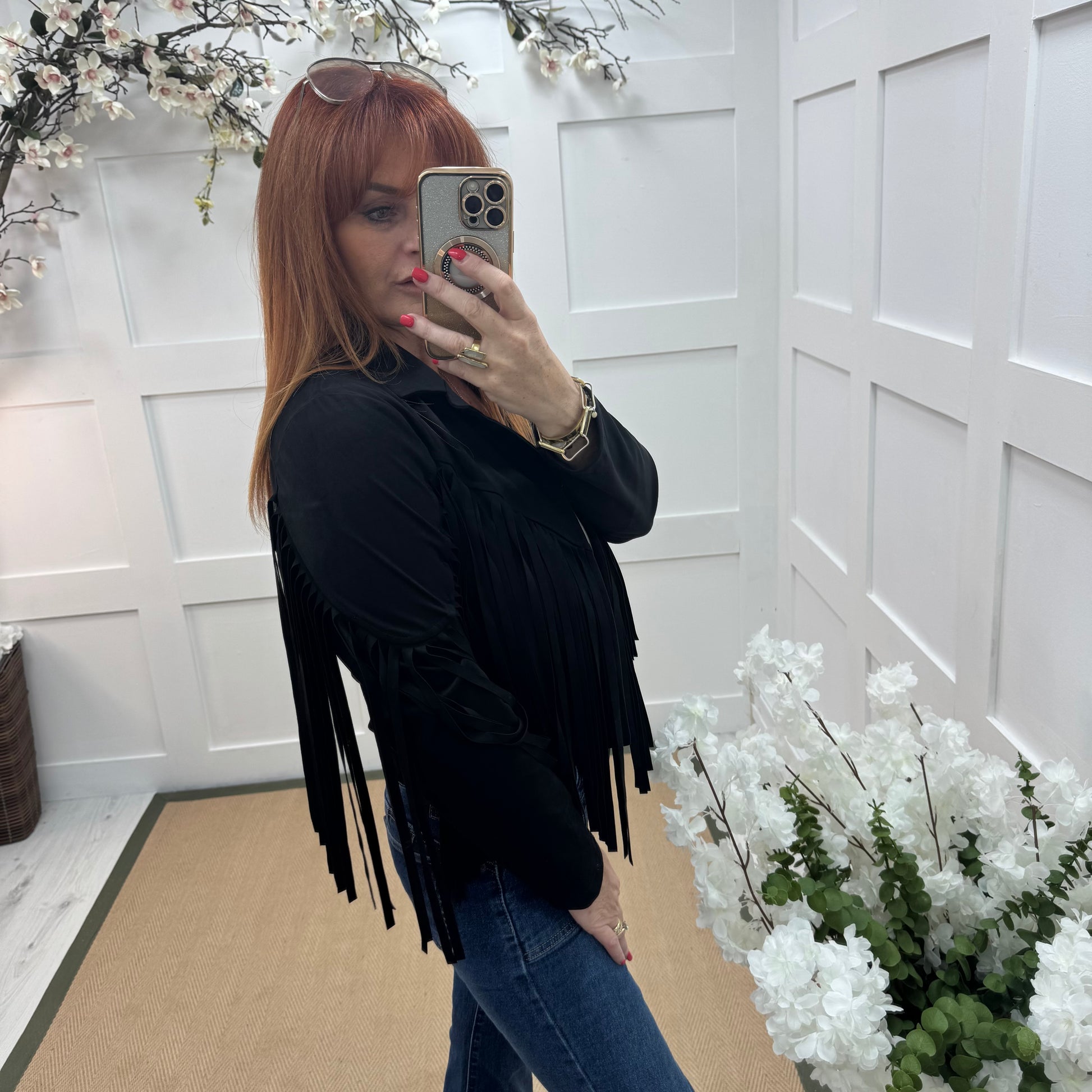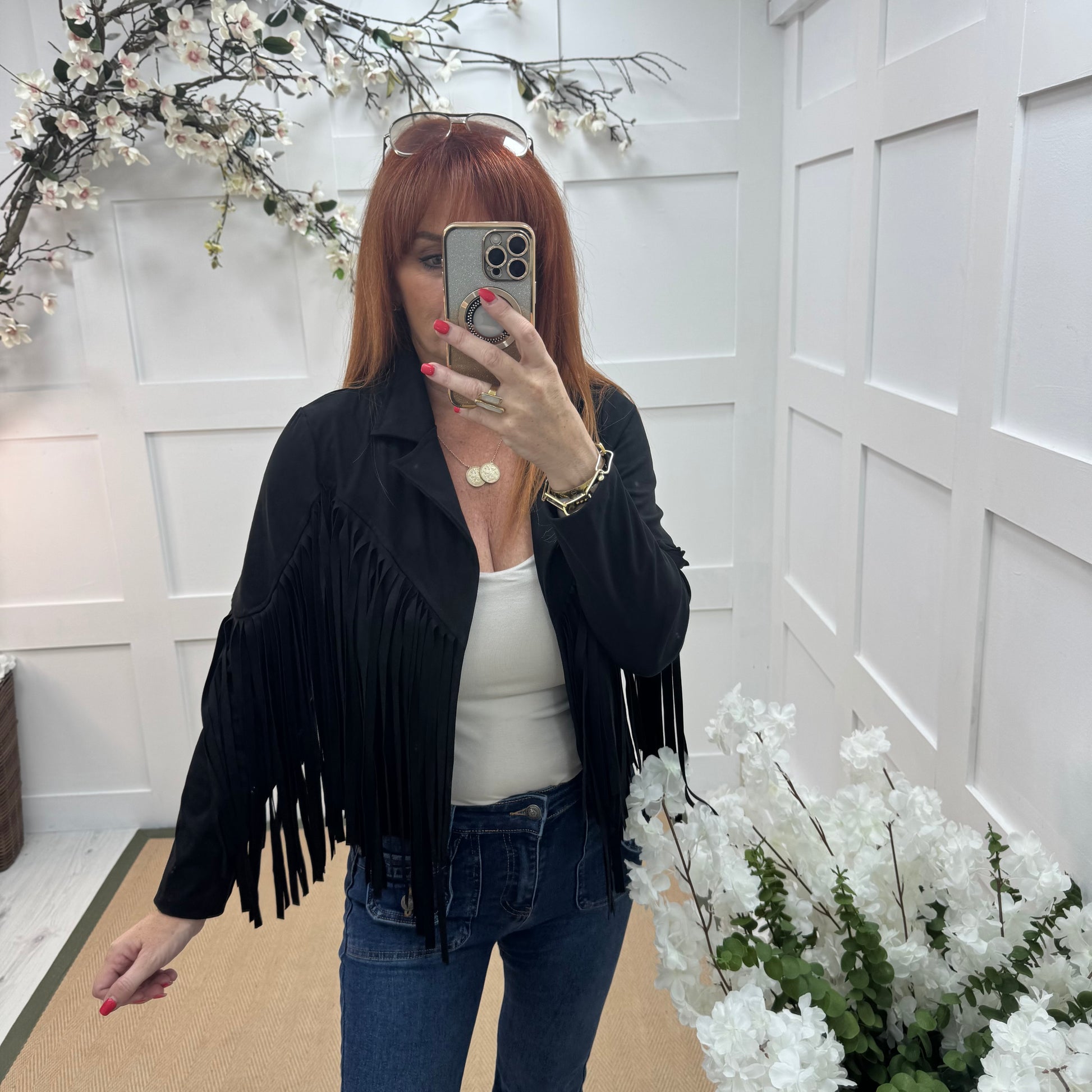 Heidi: Black short suede fringe jacket. One size: 8-14