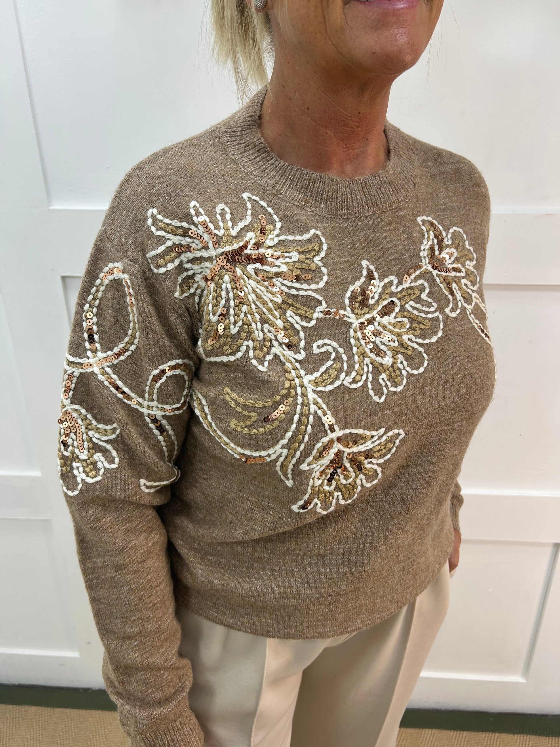 This sandy brown soft wool knitted top is a mid weight, a great layer perfect for the cooler weather. It features a gentle fit, round neck & stunning sequin detail across the front. Ideal for wearing with leather trousers or jeans, it effortlessly adds a chic touch to any outfit.