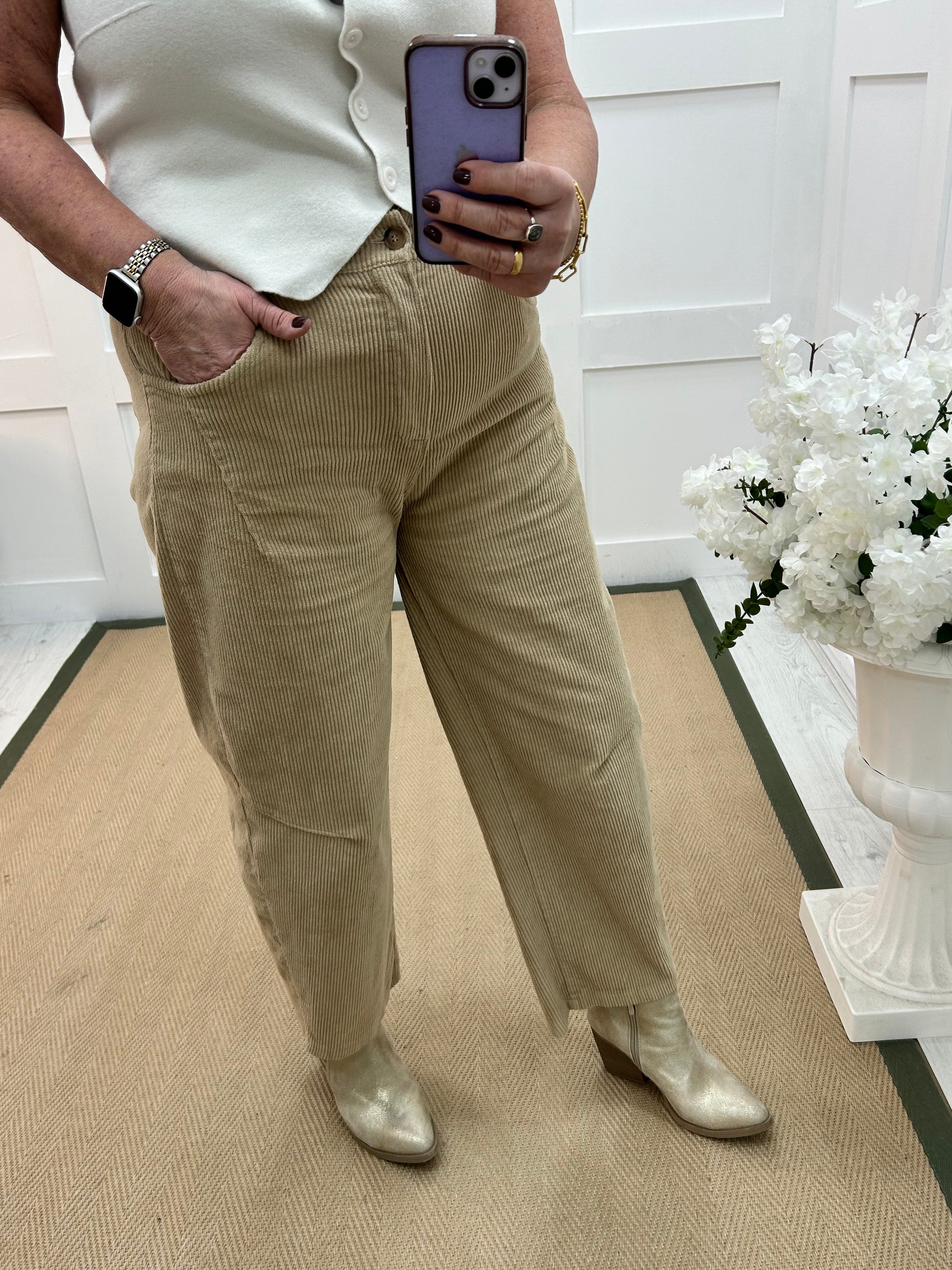 These soft beige corduroy trousers with a flattering high waist and relaxed straight-leg fit. Designed with front pockets, belt loops, and a single button fastening. Lightweight yet cosy, they’re perfect for effortless everyday styling, from casual knits to tailored blouses. Neutral, versatile, and timeless.