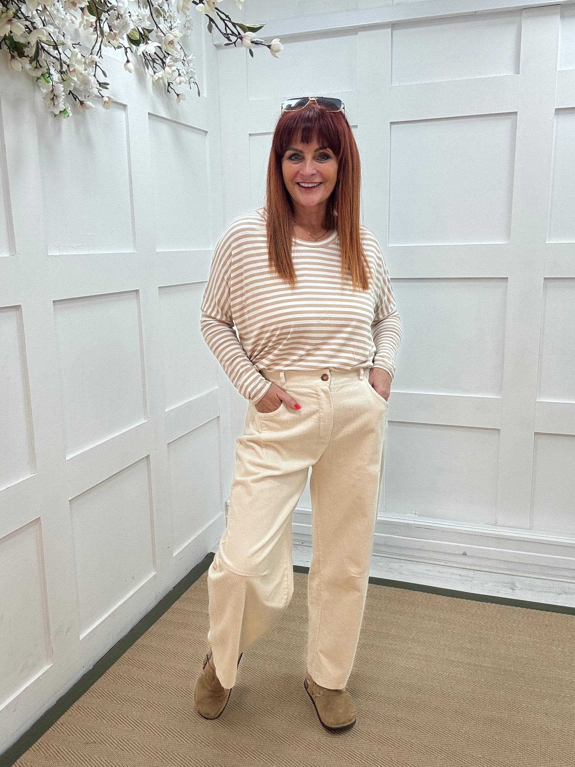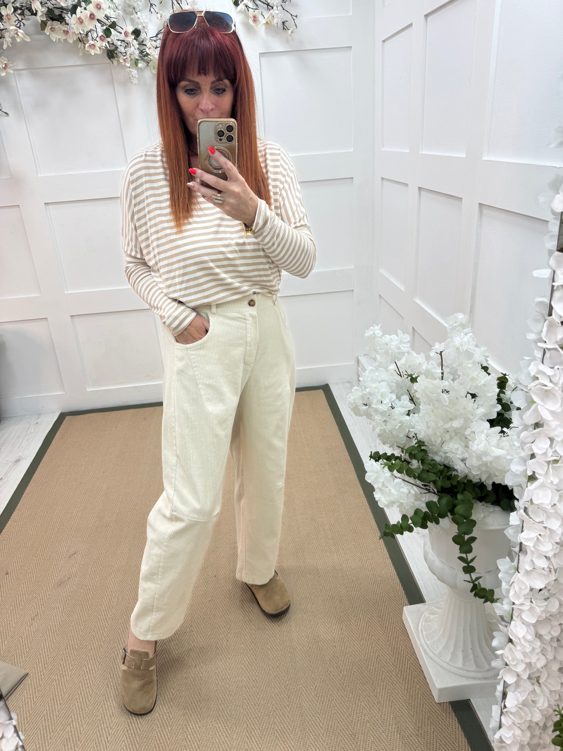 These soft cream corduroy trousers with a flattering high waist and relaxed straight-leg fit. Designed with front pockets, belt loops, and a single button fastening. Lightweight yet cosy, they’re perfect for effortless everyday styling, from casual knits to tailored blouses. Neutral, versatile, and timeless.