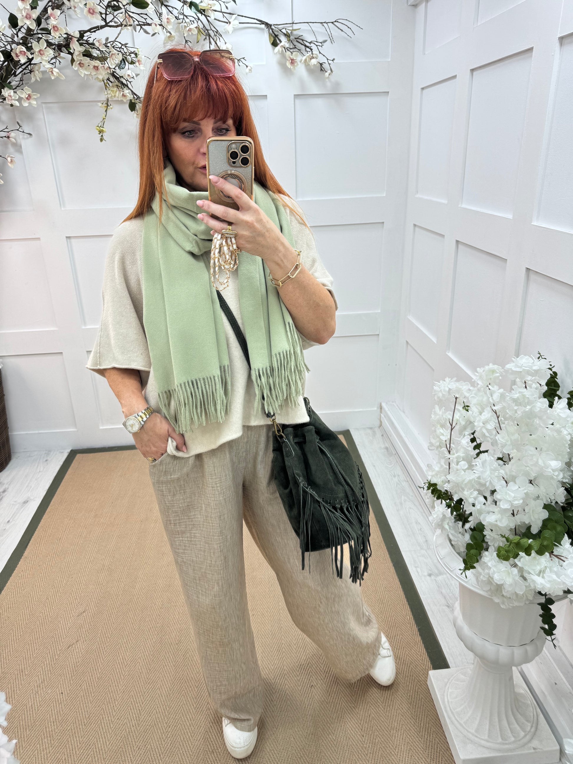 This elegant soft green ladies’ scarf is a soft, lightweight fabric that drapes beautifully for a delicate, airy feel. Long tassels around the hemline add a sophisticated touch. This classy piece is perfect for adding a hint of glam to any outfit while maintaining an elegant, feminine look.