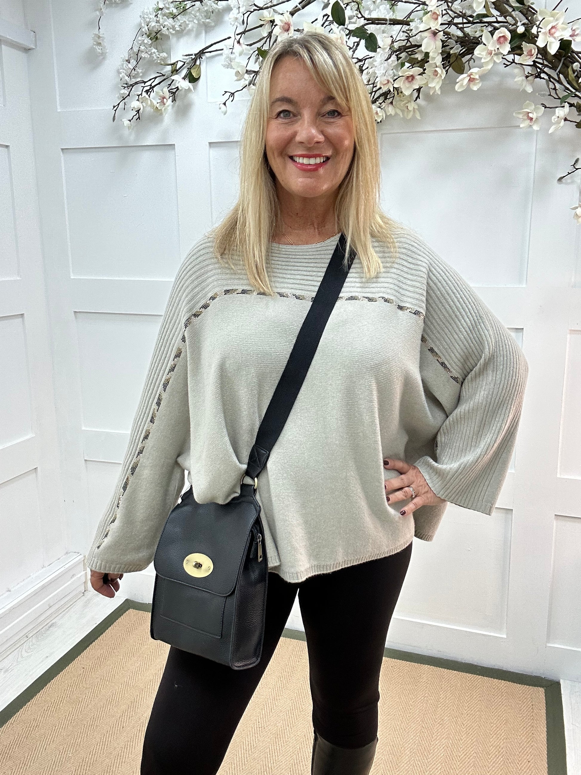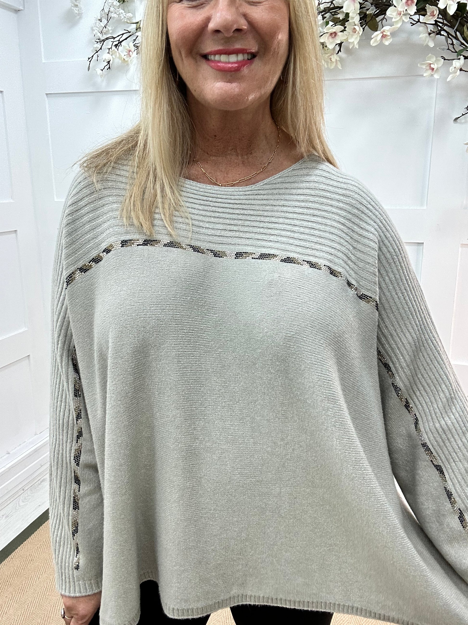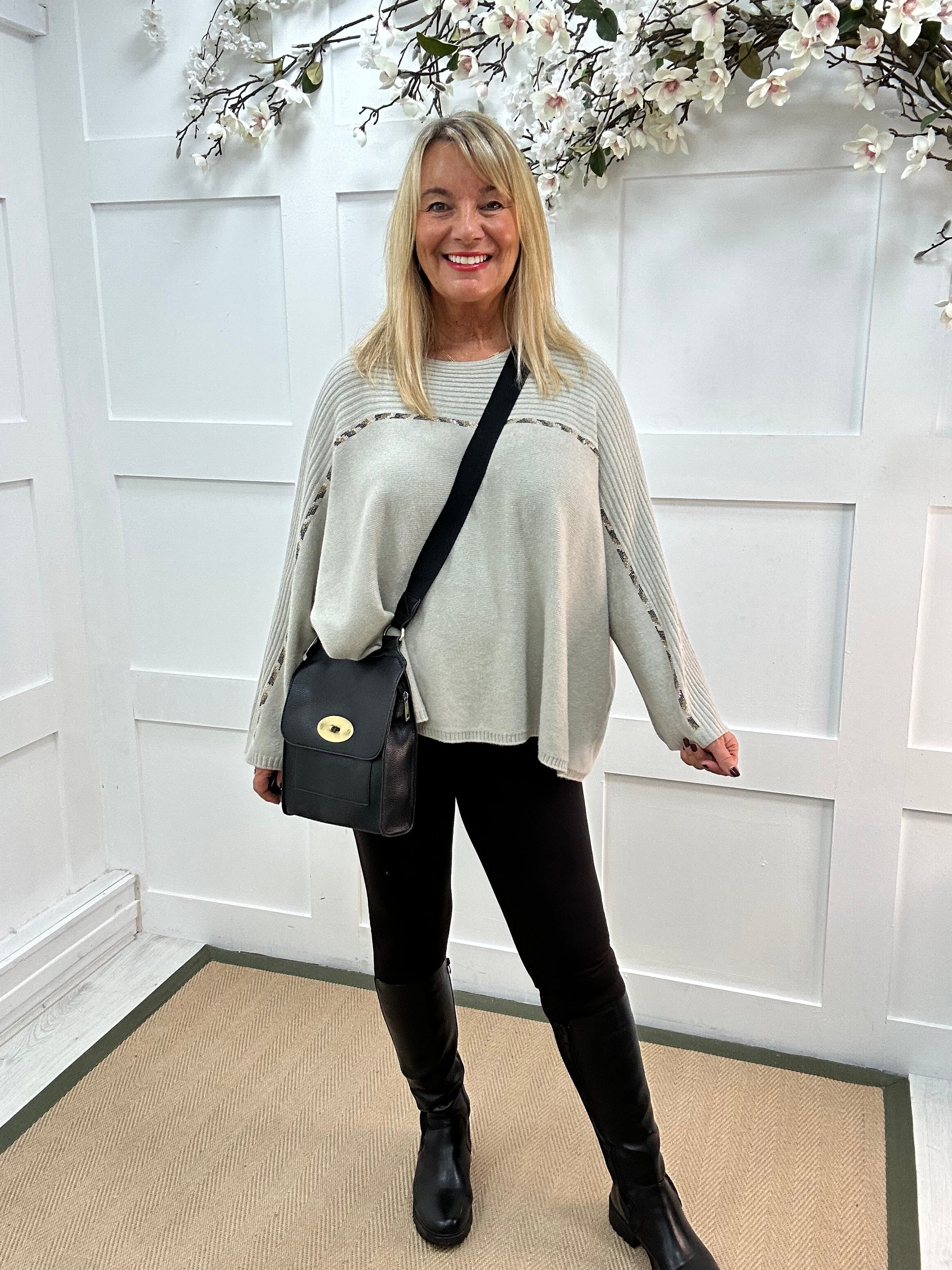 This oversized stone sweater combines casual comfort with a touch of leopard sparkle. It features a diamanté-embellished stripe, adding a glam look. With long sleeves and a relaxed fit, it’s perfect for effortlessly chic daywear teamed up with plain leggings.