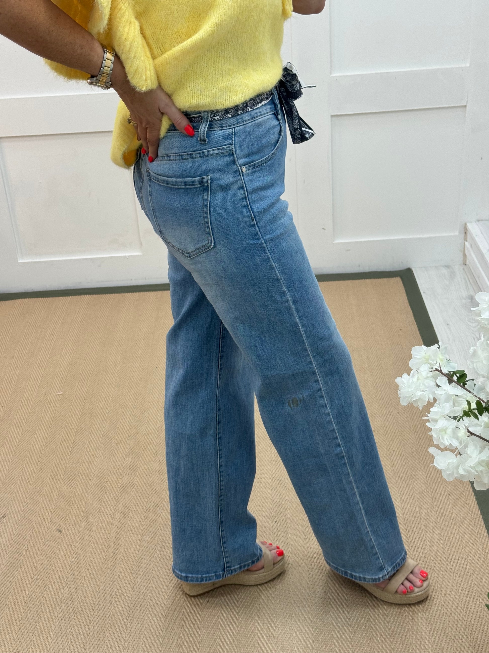 These wide leg washed denim jeans offer a perfect blend of comfort and style. Designed with a high waist, featuring a removable ribbon belt, front side pockets & rear pockets for that on-trend look, they accentuate the waistline while elongating the legs. The stretchy denim ensures all-day comfort and flexibility, while the wide-leg cut creates a chic, relaxed, and effortlessly stylish silhouette.