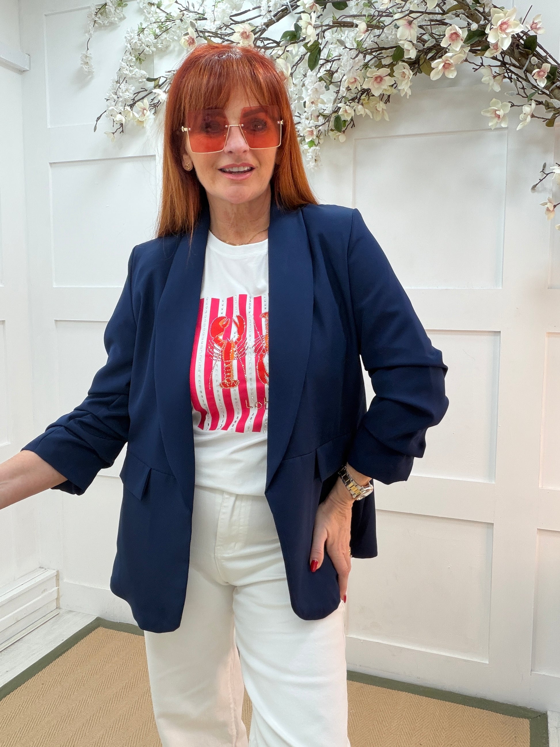 A sophisticated yet stylish fully lined blazer featuring chic ruched sleeves for a modern touch. Tailored for a flattering fit, it offers structure while maintaining a comfortable feel. Perfect for both professional and casual looks, this versatile piece effortlessly elevates any outfit with its polished yet relaxed appeal.