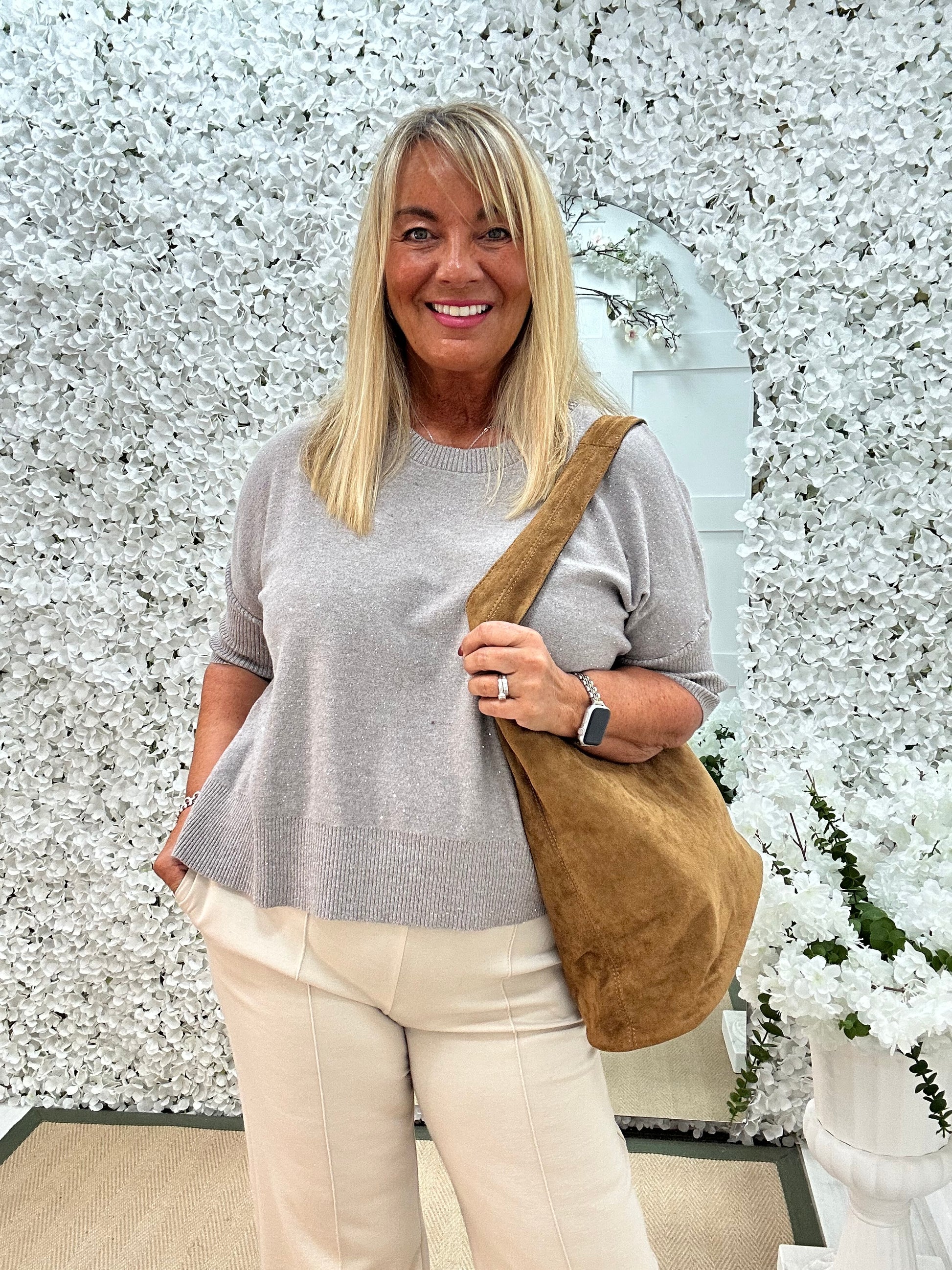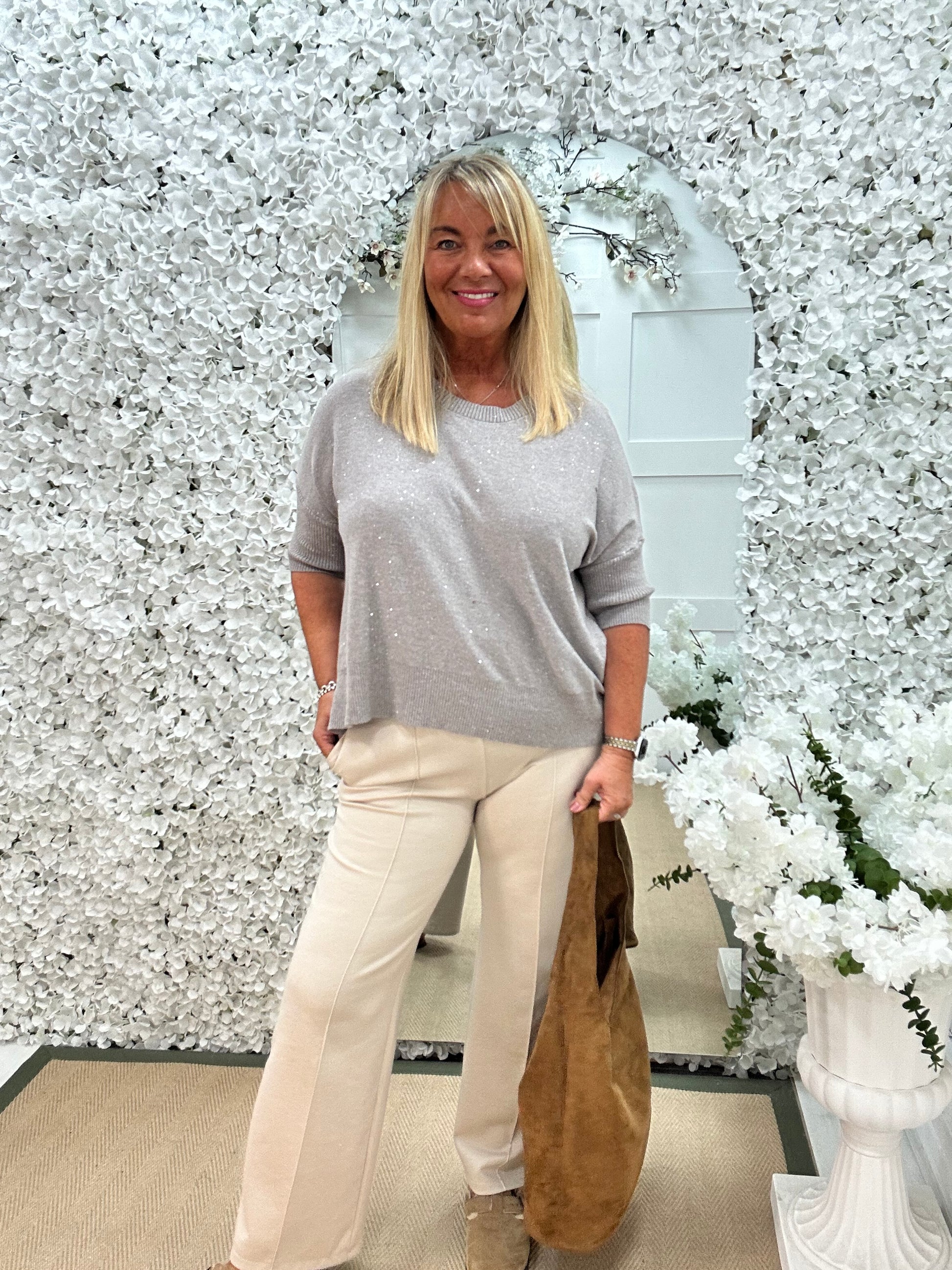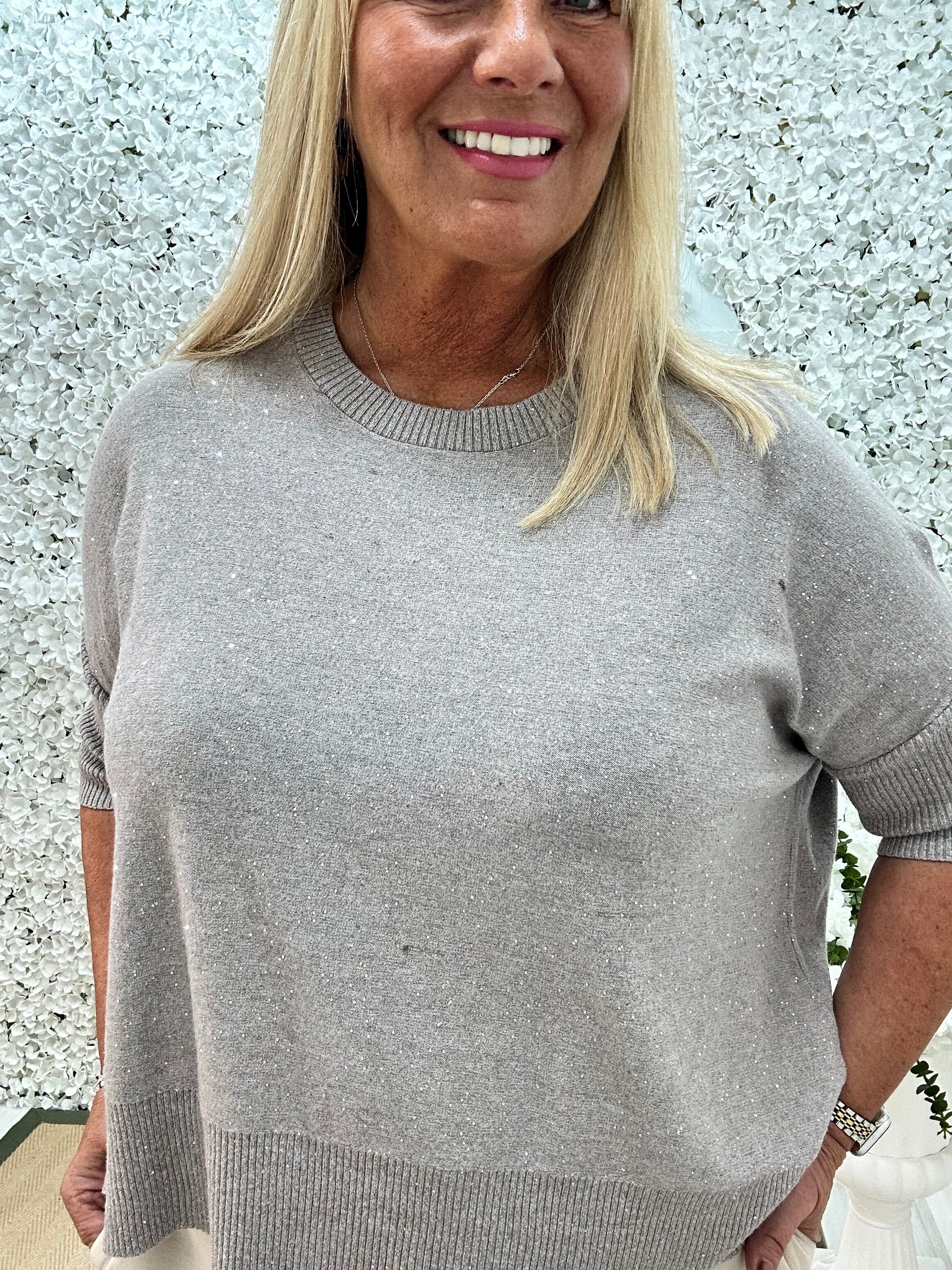 This stretchy knit jumper is effortlessly chic with its soft fabric and relaxed fit. Featuring an all over sparkle and short sleeves, it blends comfort with understated elegance. Perfect for pairing with leather trousers or jeans, it’s a versatile piece for both casual and dressy looks