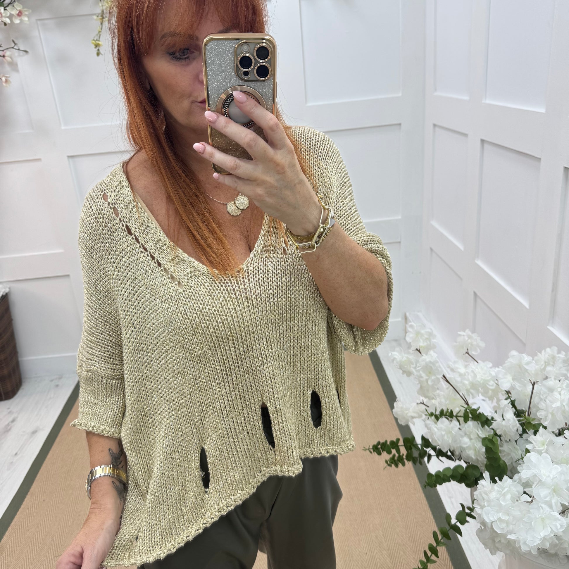 Kathy: Gold stretchy lurex ripped knit top. One size: 12-18
