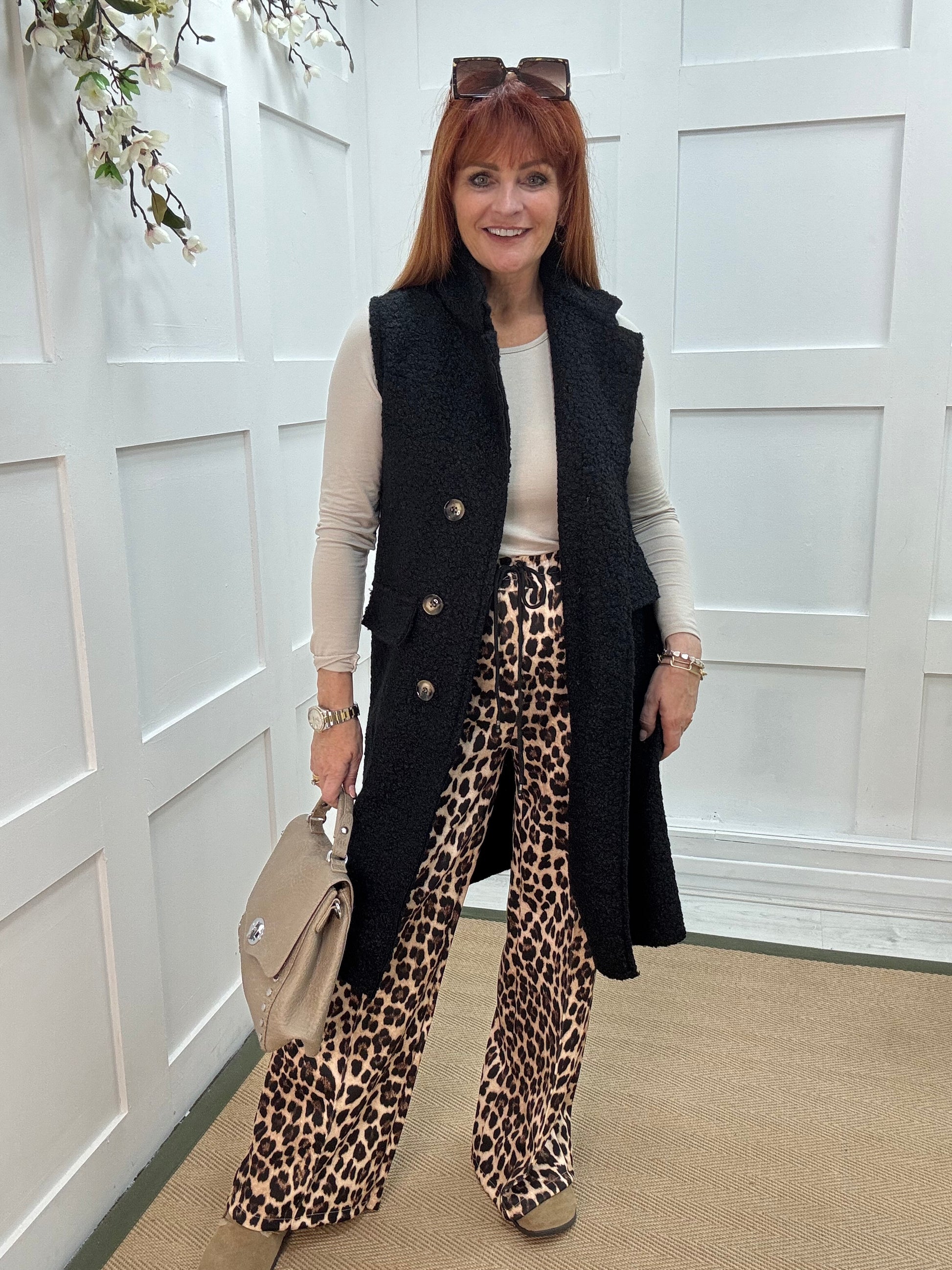 This elegant Made in Italy waistcoat is crafted in a soft, textured teddy-style fabric, offering both warmth and style. Featuring a tailored longline cut, double-breasted button fastening, and flap pockets, it adds chic layering to any outfit. The classic black colour makes it versatile, effortlessly pairing with casual or smart looks for timeless sophistication.
