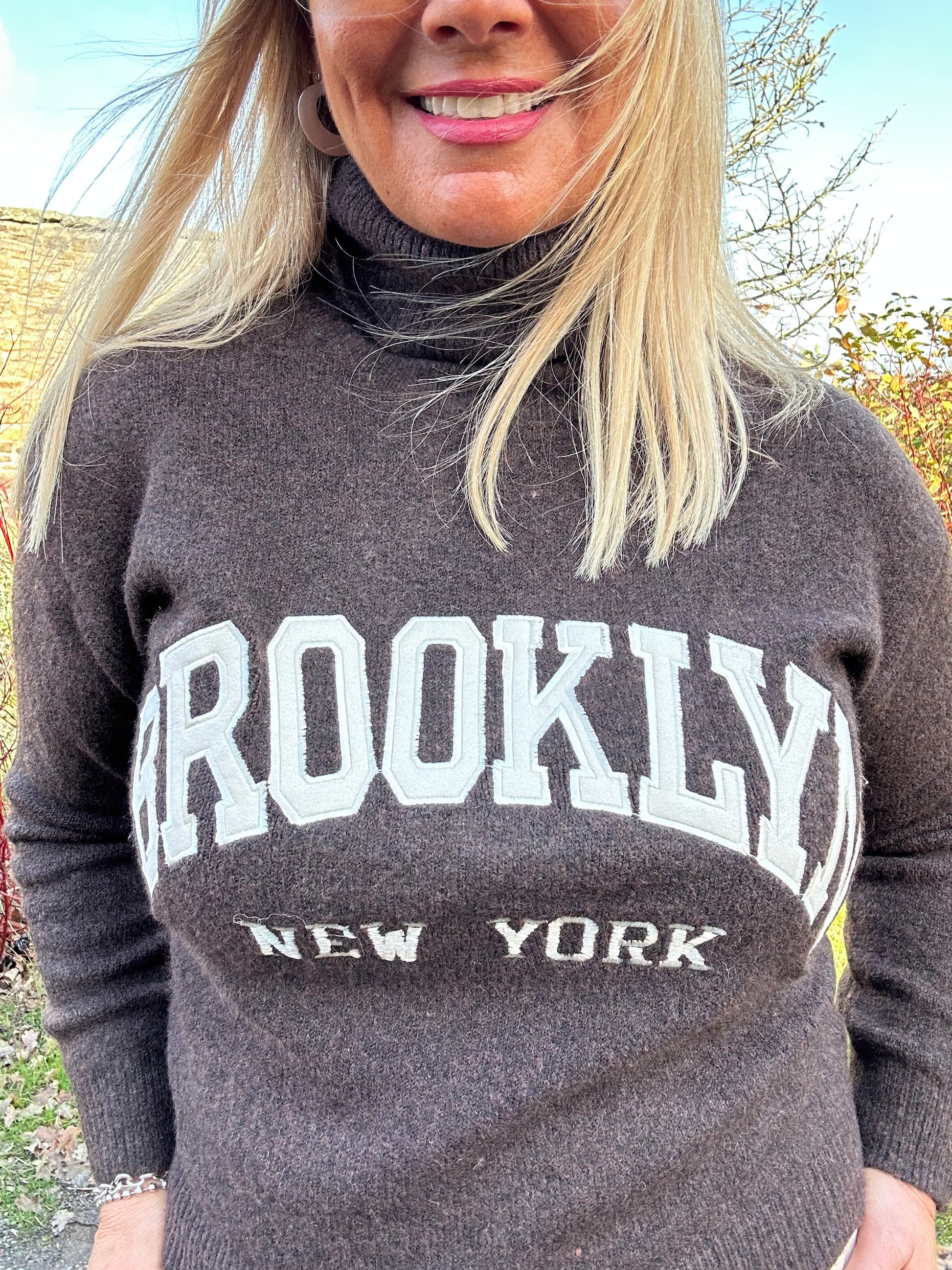 This cozy brown knit sweater features a bold “Brooklyn New York” appliqué across the chest, giving it a relaxed, sporty vibe. Made from a soft blend of viscose, wool, and elastane, it offers warmth and stretch for all-day comfort. Perfect for casual styling with jeans or layered over shirts.