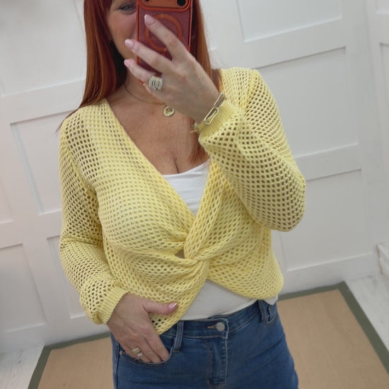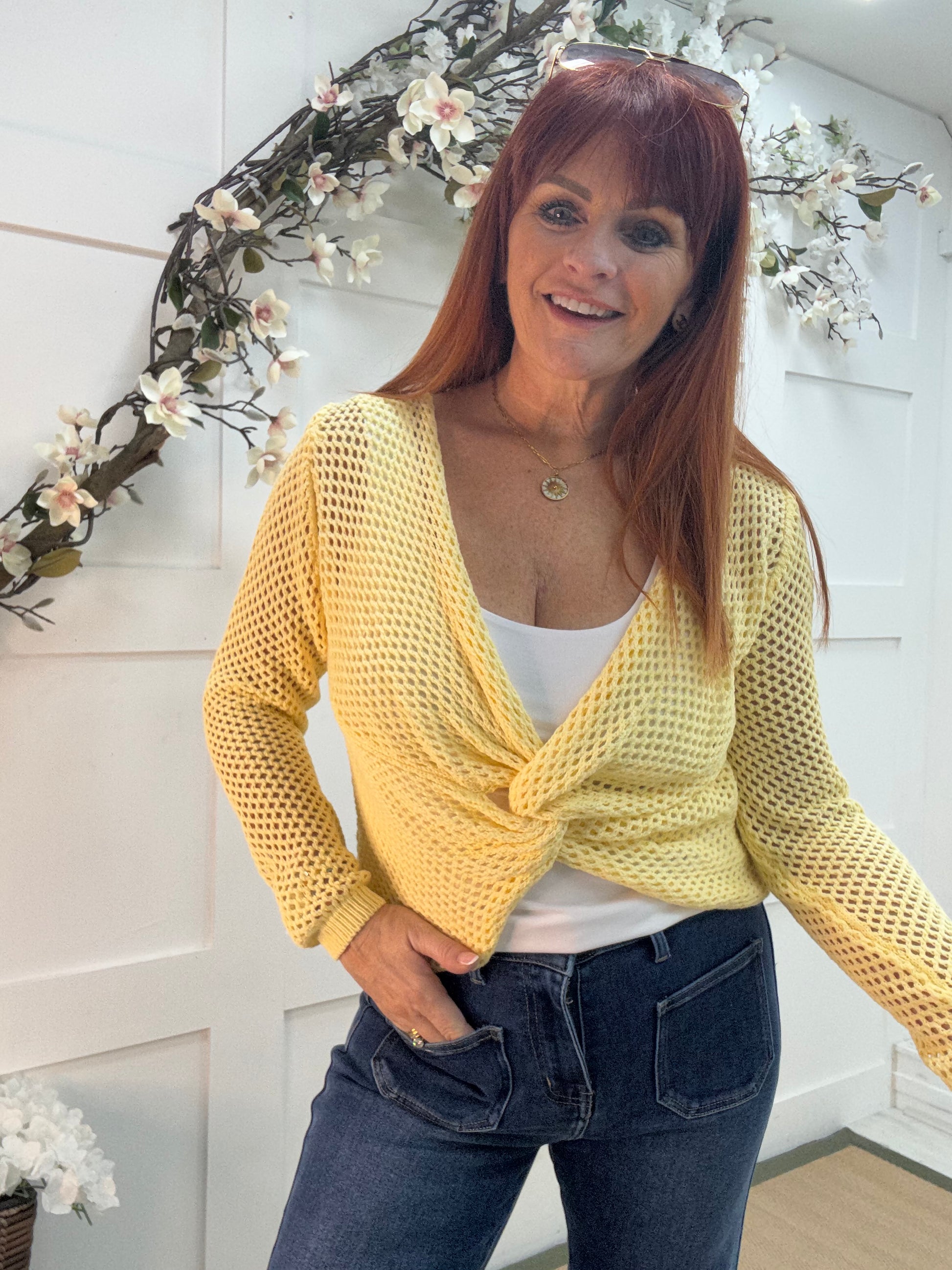 This soft lemon knit top features an open mesh design with a lightweight, breathable feel. A flattering twisted front detail creates a subtle cropped silhouette, while the relaxed long sleeves add effortless drape. Perfect for layering over camisoles or bralettes, it offers a fresh, spring-ready look with casual, feminine charm.