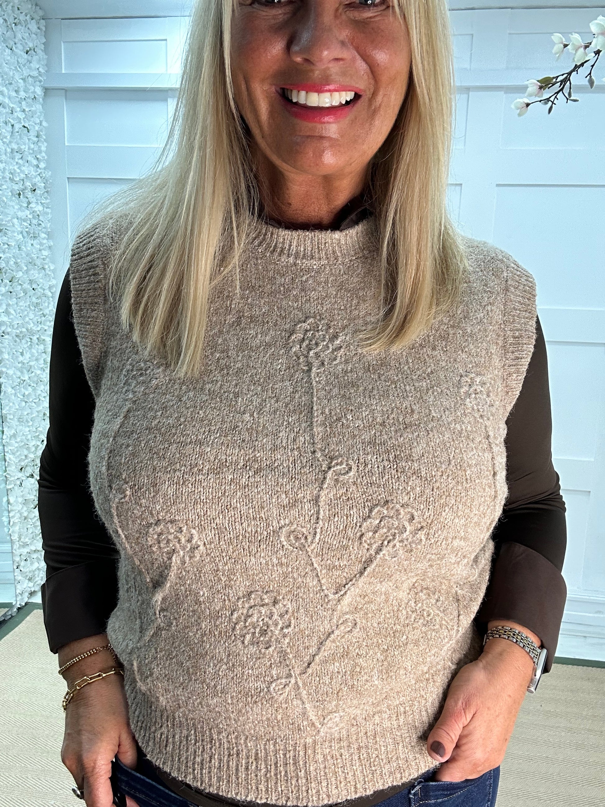 Larry: Beige sleeveless tank top with flower detail. One Sz: 12-18