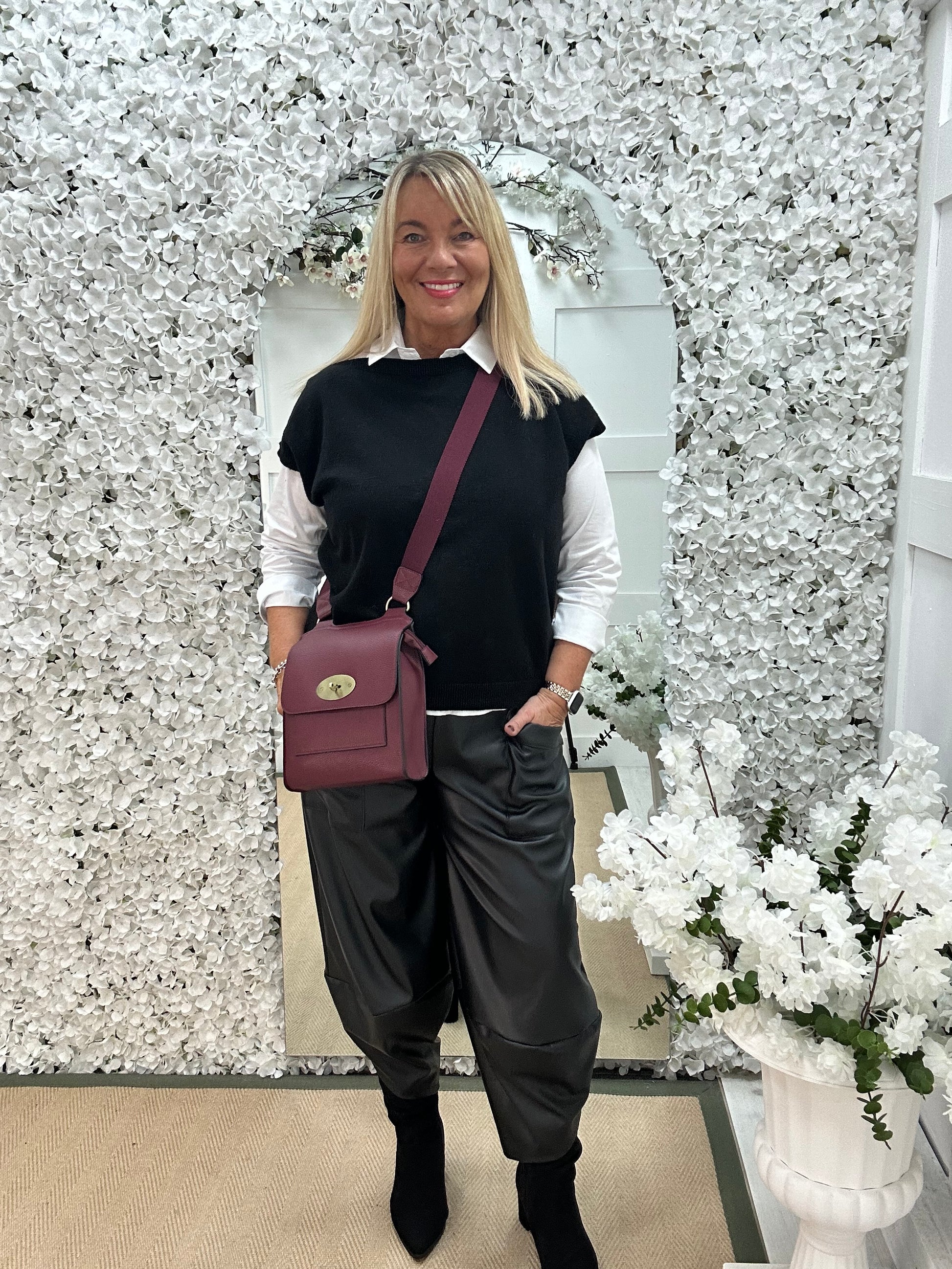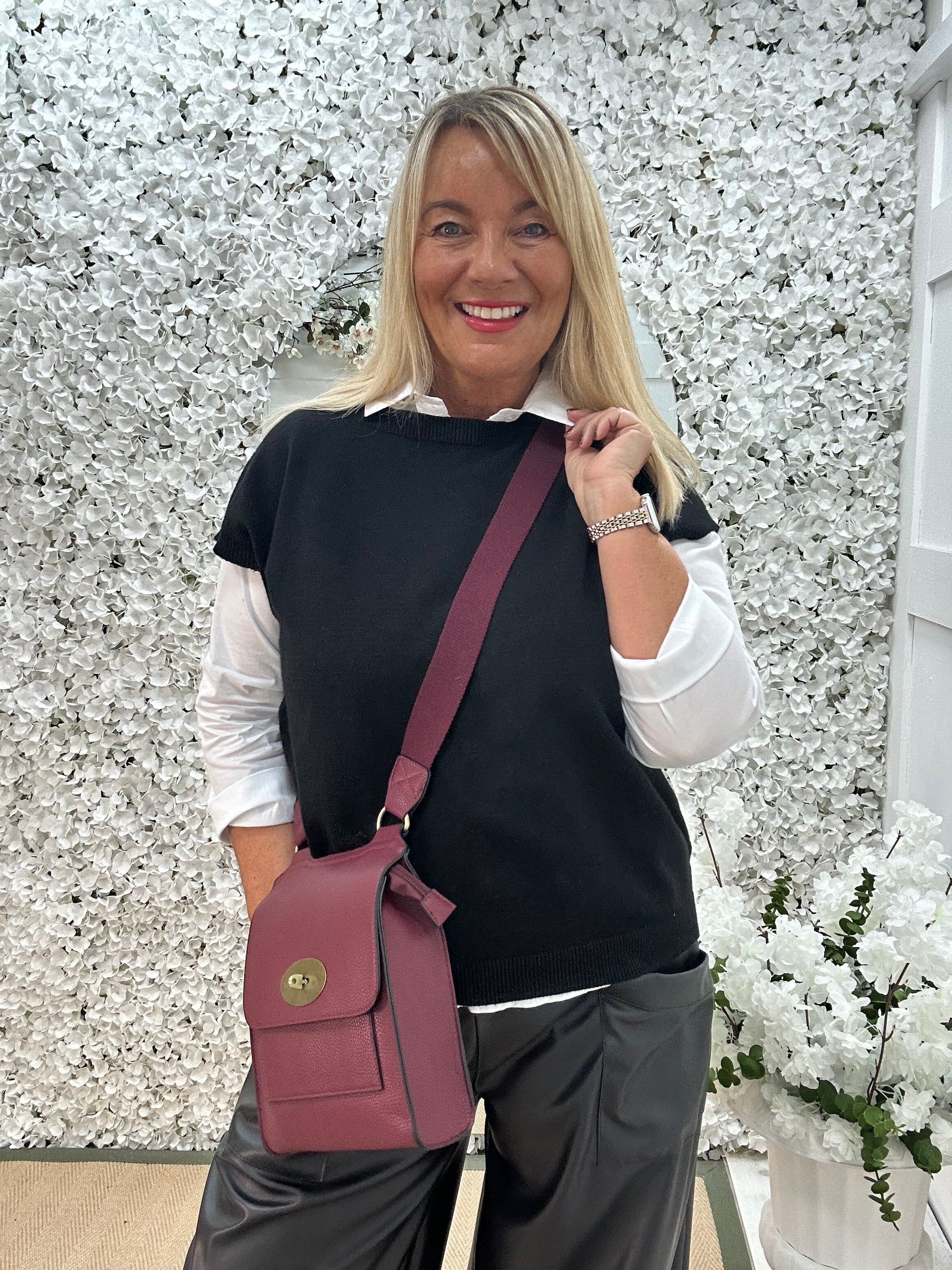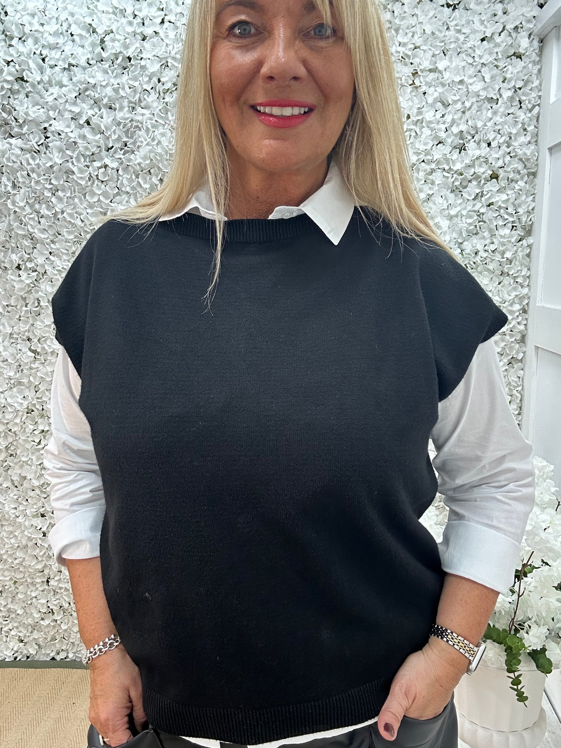 This white collared button-up shirt, layered underneath a black knit blends comfort with understated elegance. The stretchy knit jumper is effortlessly chic with its soft fabric, featuring statement gold buttons along the back. Perfect pairing with trousers or jeans, it’s a versatile piece for both casual and dressy looks.