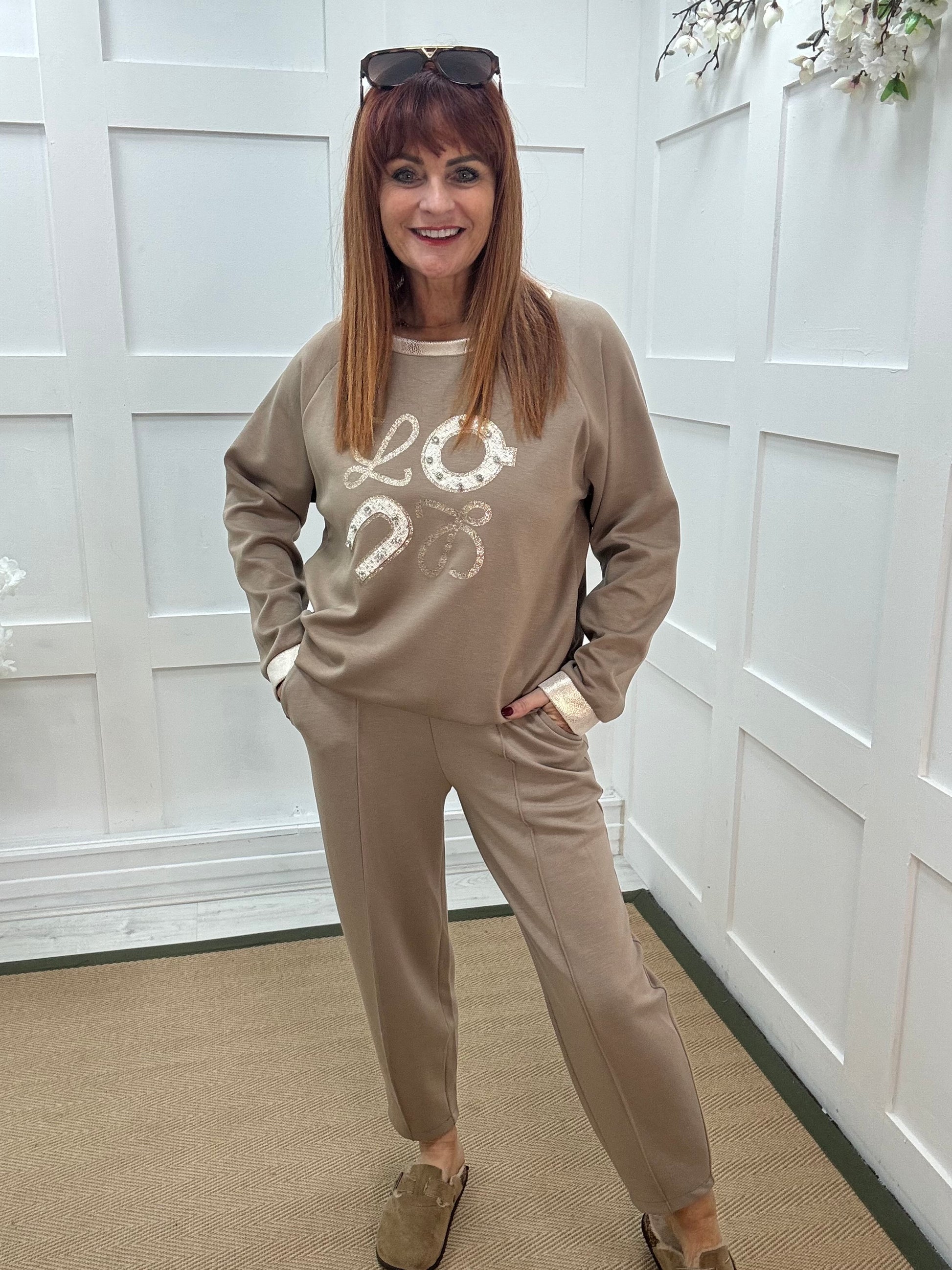 Liana: Mocha diamanté logo sweatshirt. One size: 12-16