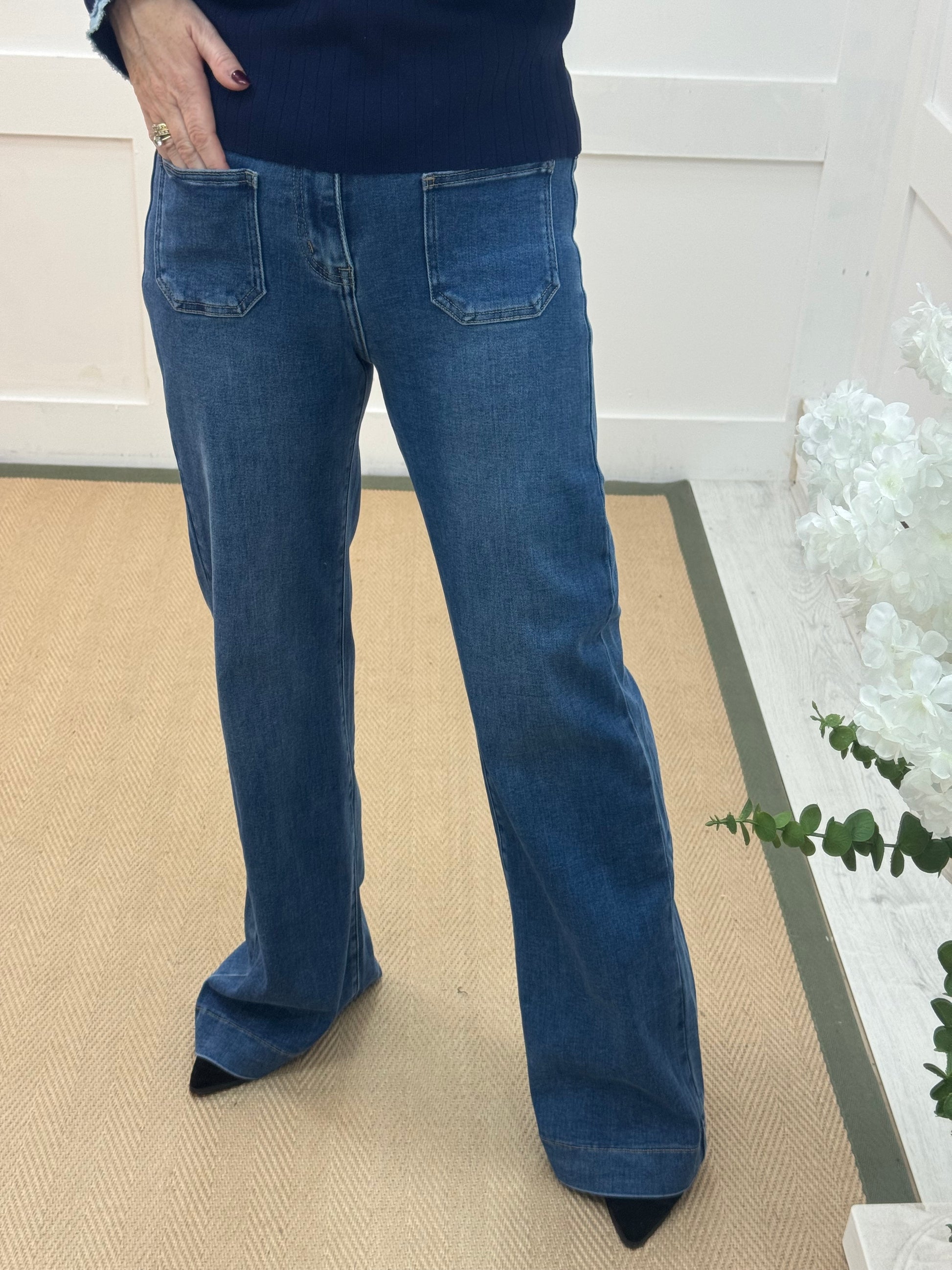 Jemma: Mid blue long leg front pocket jeans. Sizes: 8-14