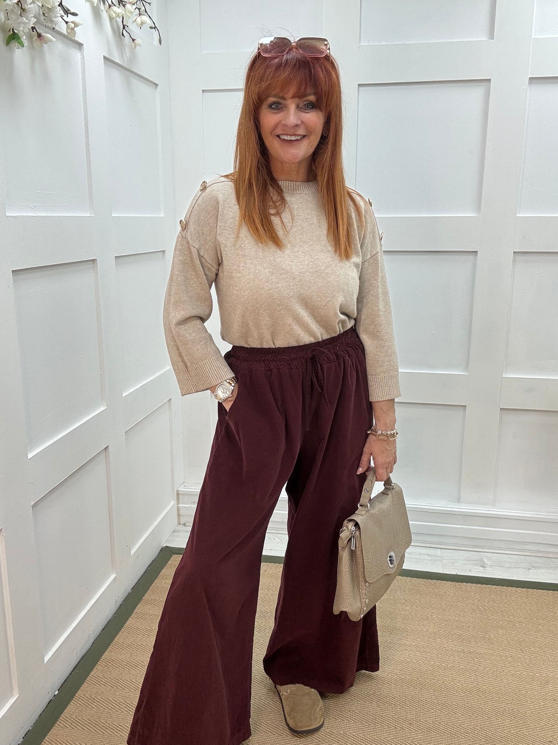 This stretchy knit jumper is effortlessly chic with its soft oatmeal fabric and relaxed fit. Featuring statement gold buttons on the shoulders and wide sleeves, it blends comfort with understated elegance. Perfect for pairing with trousers or jeans, it’s a versatile piece for both casual and dressy looks