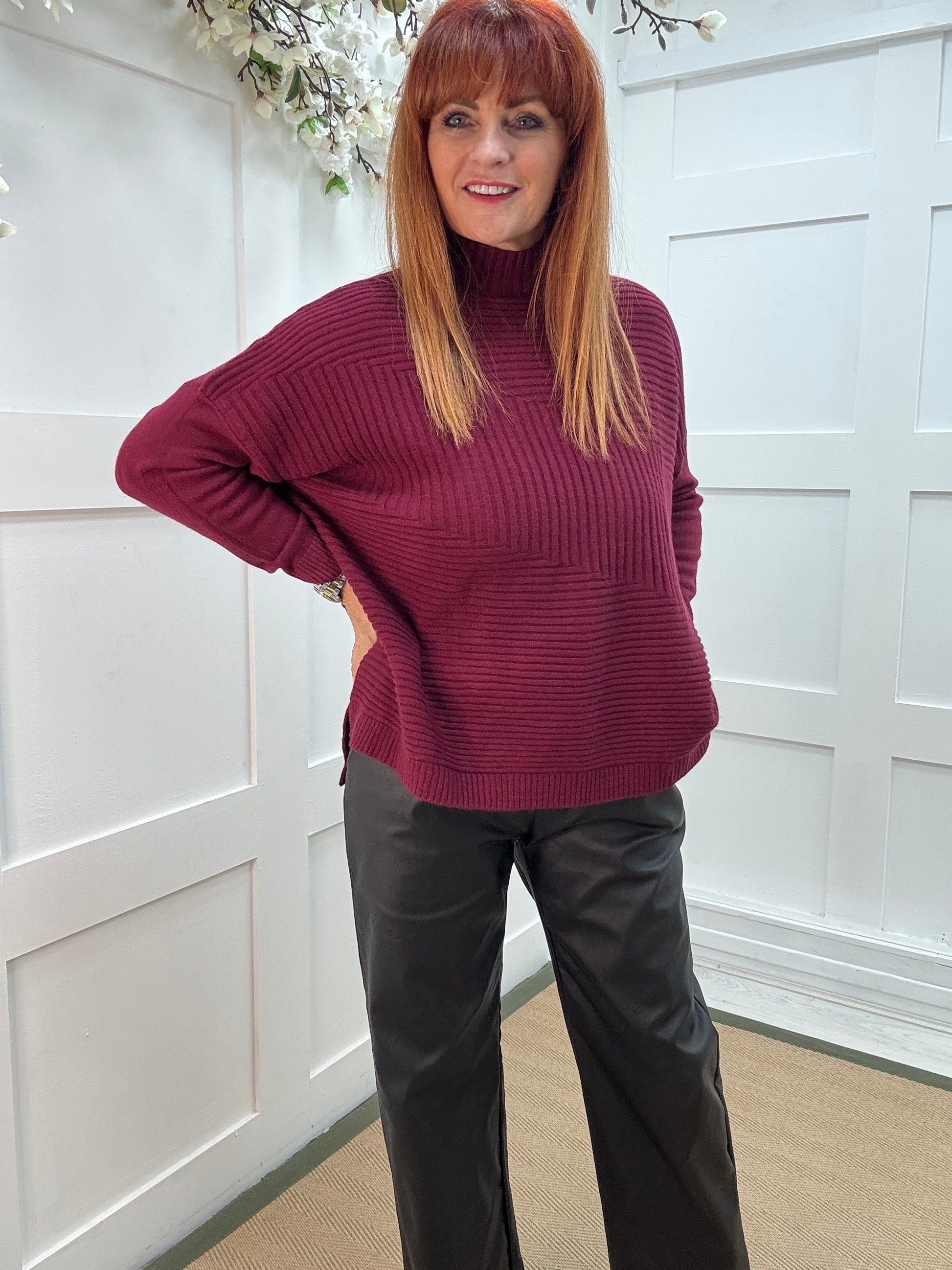 CJ: Burgundy high neck knitted top. One Sz: 12-18