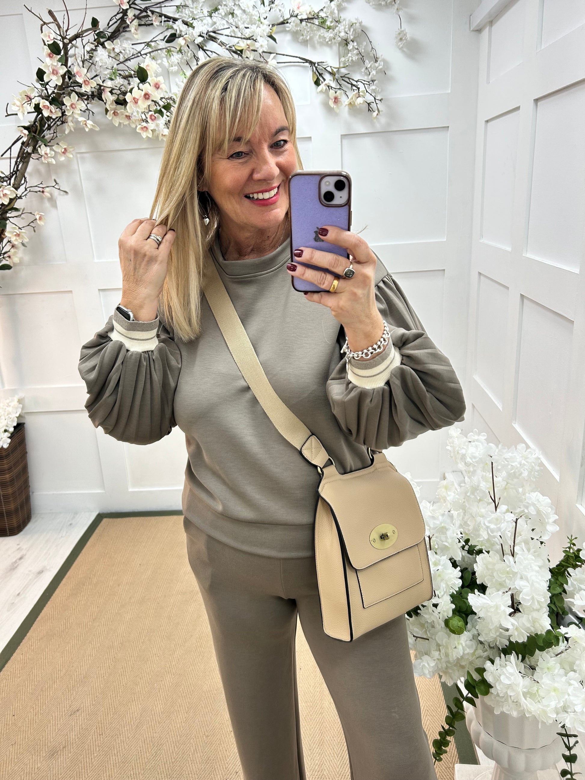 This relaxed taupe lounge set designed for effortless comfort and style. Featuring a soft long-sleeve top with elegant pleated balloon sleeves and matching wide-leg bottoms. Crafted from a smooth, cozy fabric, this versatile set is perfect for lounging at home or casual everyday wear.