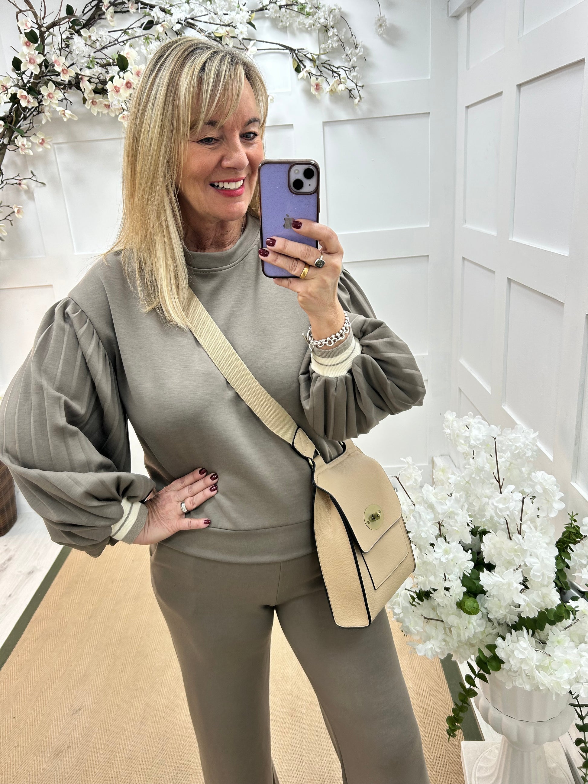 Luanne: Mocha pleated sleeve 2 piece loungewear set. One size: 10-16