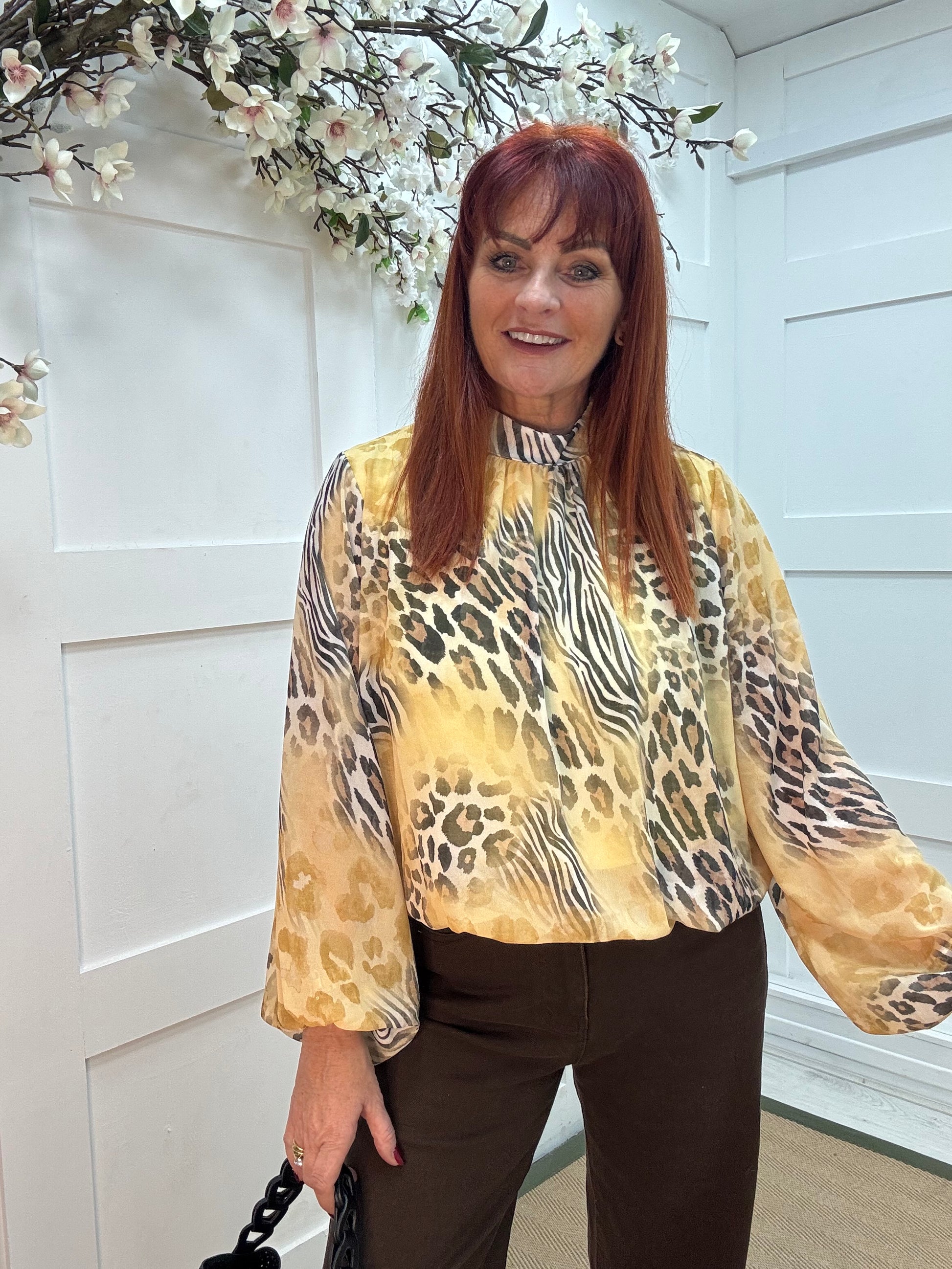 This sheer, lightweight blouse features a striking blend of animal prints, including leopard and zebra, in warm golden and neutral tones. Designed with soft, billowy sleeves, it offers a bold yet elegant statement. Perfect for adding texture and personality to both casual and elevated looks.