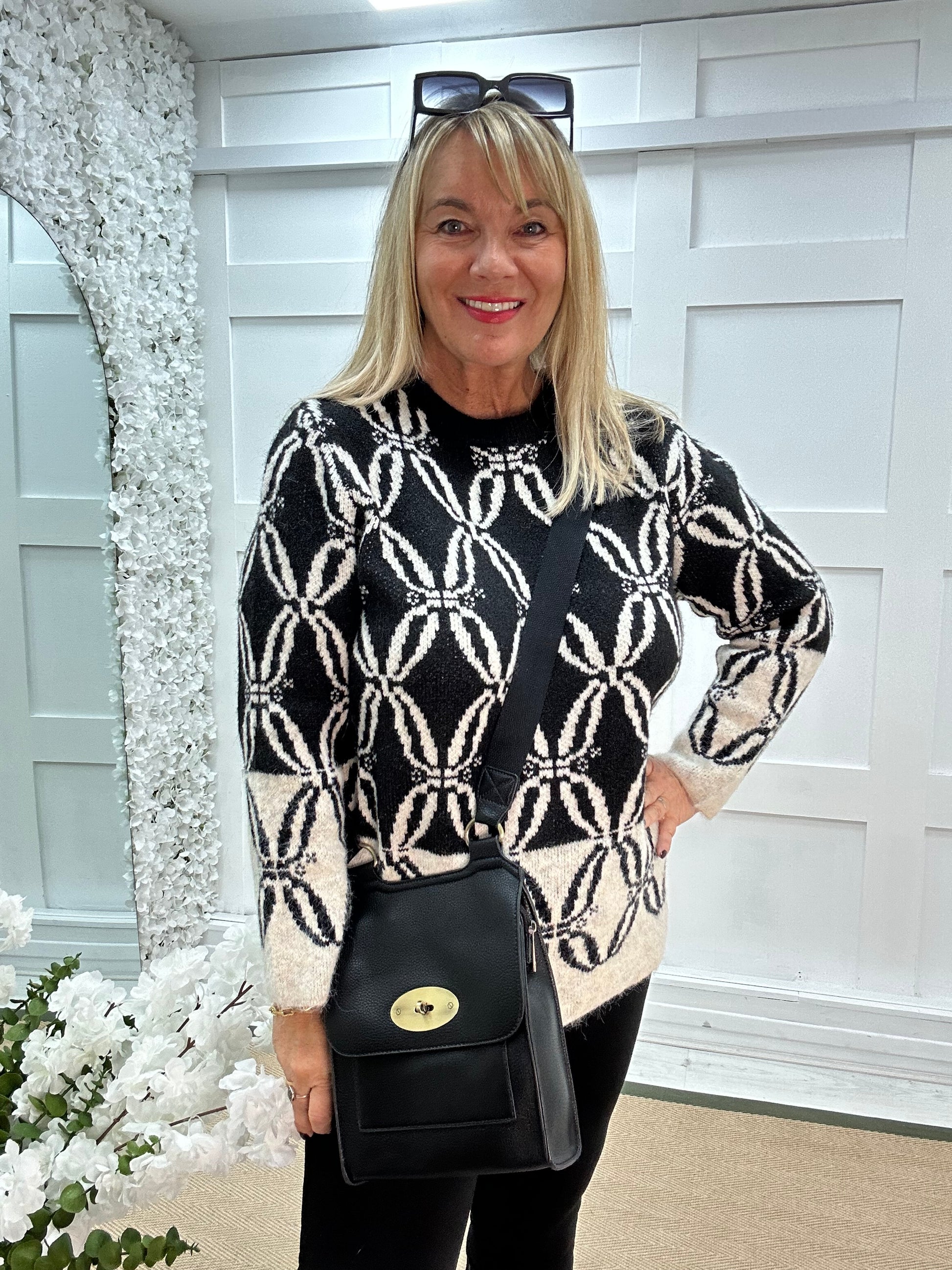 This cosy wool-blend top features a striking black-and-cream geometric pattern that adds instant style. Soft, warm, and beautifully textured, it has a relaxed fit with ribbed cuffs and a comfortable neckline. Perfect for pairing with leggings or jeans, it delivers effortless winter chic while keeping you snug on cooler days. A standout knit for everyday wear.