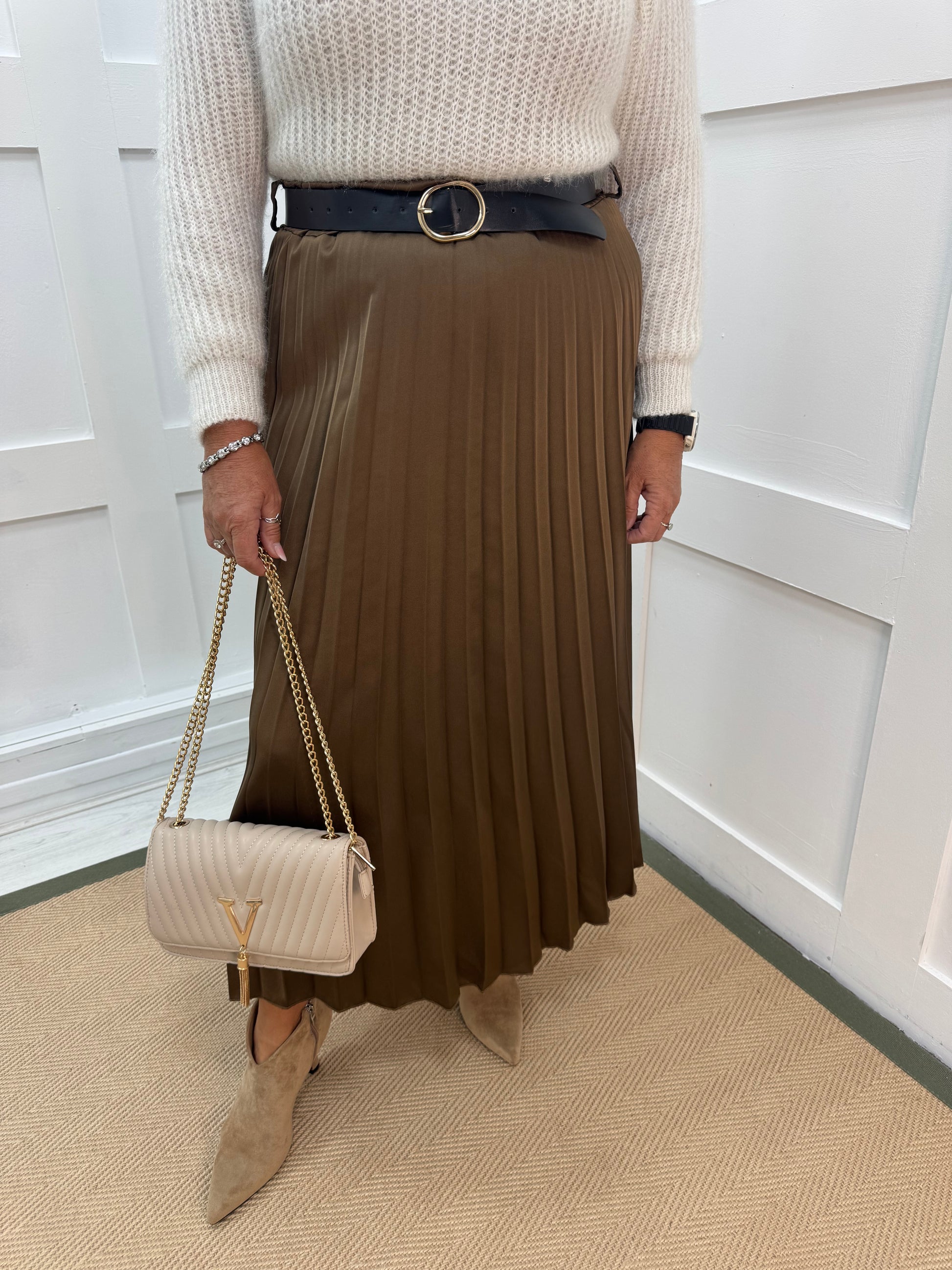 Mara: Brown silky feel pleated maxi skirt. One size: 10-14