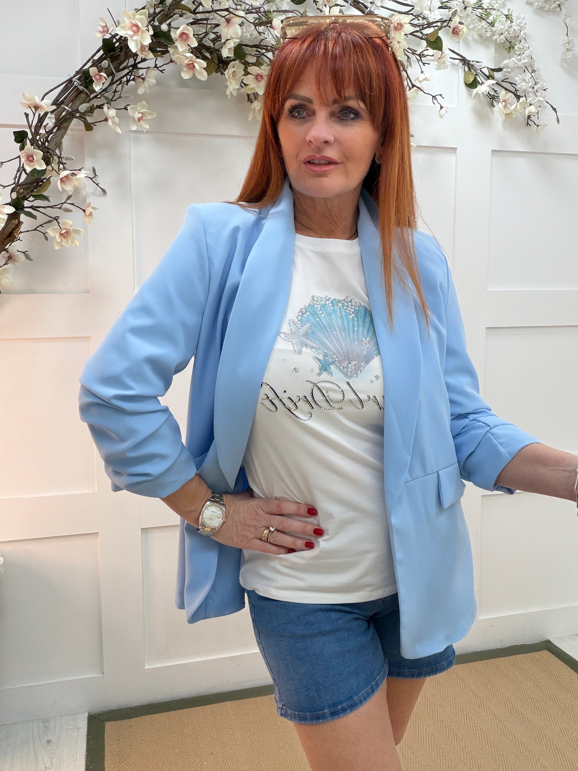 This fresh white tee features a beautiful coastal-inspired design with a shimmering blue shell and starfish detail, finished with subtle sparkle accents. Made from soft, breathable fabric with a relaxed fit, it’s perfect for warm days. Style with denim or shorts for an effortless, chic look with a breezy seaside feel.