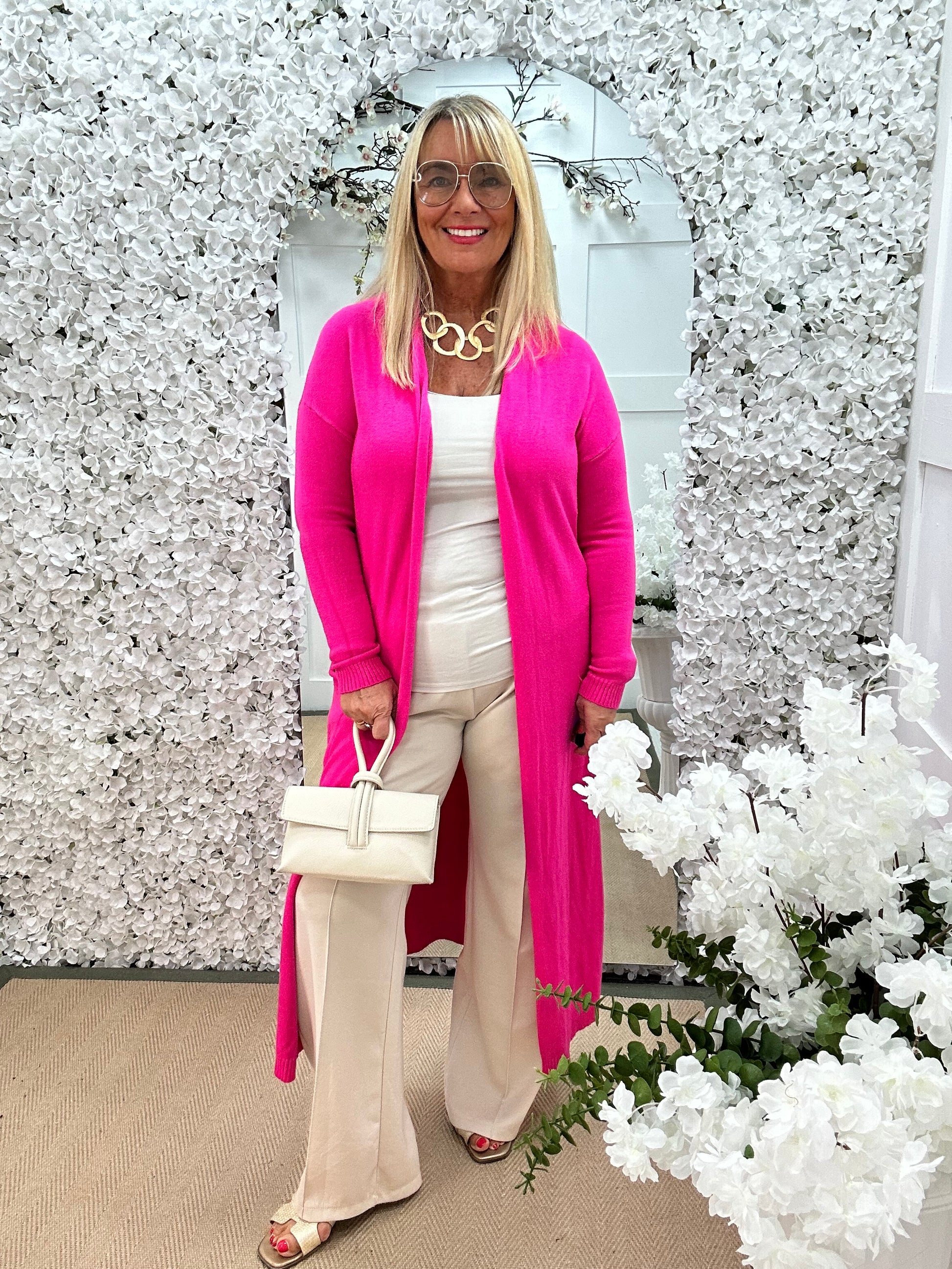 This Italian knit longline cardigan offers timeless elegance and everyday comfort. Designed with an open, edge-to-edge front, it layers effortlessly over any outfit. The plain knit finish adds a touch of sophistication, while the two practical front pockets and full-length sleeves enhance functionality. A versatile wardrobe staple, perfect for chic casual or smart layering.