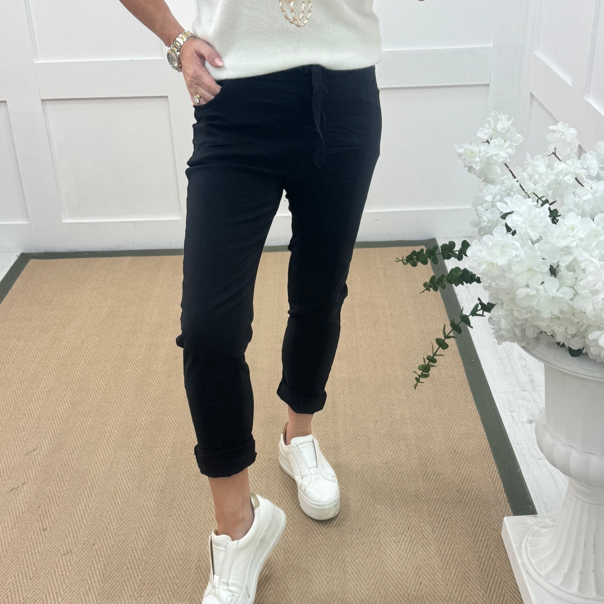 Why are they called Magic Trousers? These super stretchy magic pants are a must for any wardrobe. Elastic waist magic pants from Made in Italy are ultra-stretchy, comfortable, and versatile. Featuring a flexible waistband, rear pockets, and super-stretch legs, they provide a flattering fit. The lightweight fabric allows for easy movement, and the legs can be rolled up for a cropped look. Perfect for casual, chic, or travel wear.