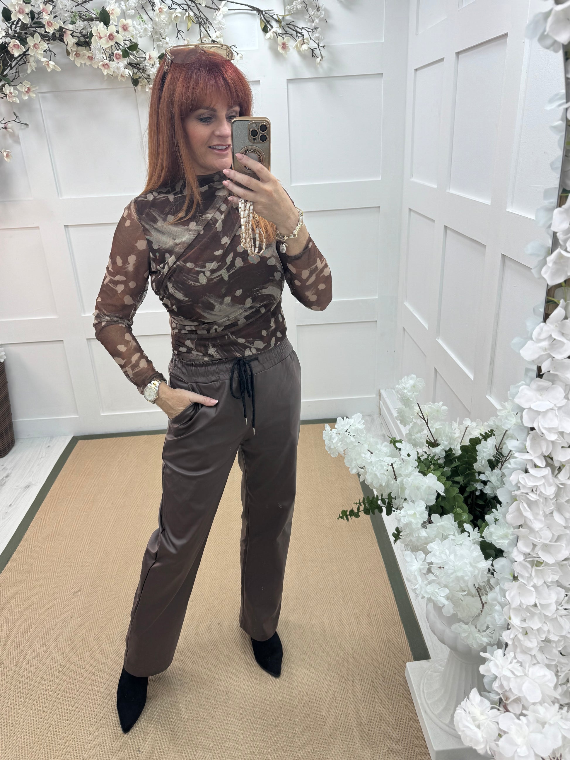 Maya: Brown pattern ruched mesh top. One Sz: 12-18