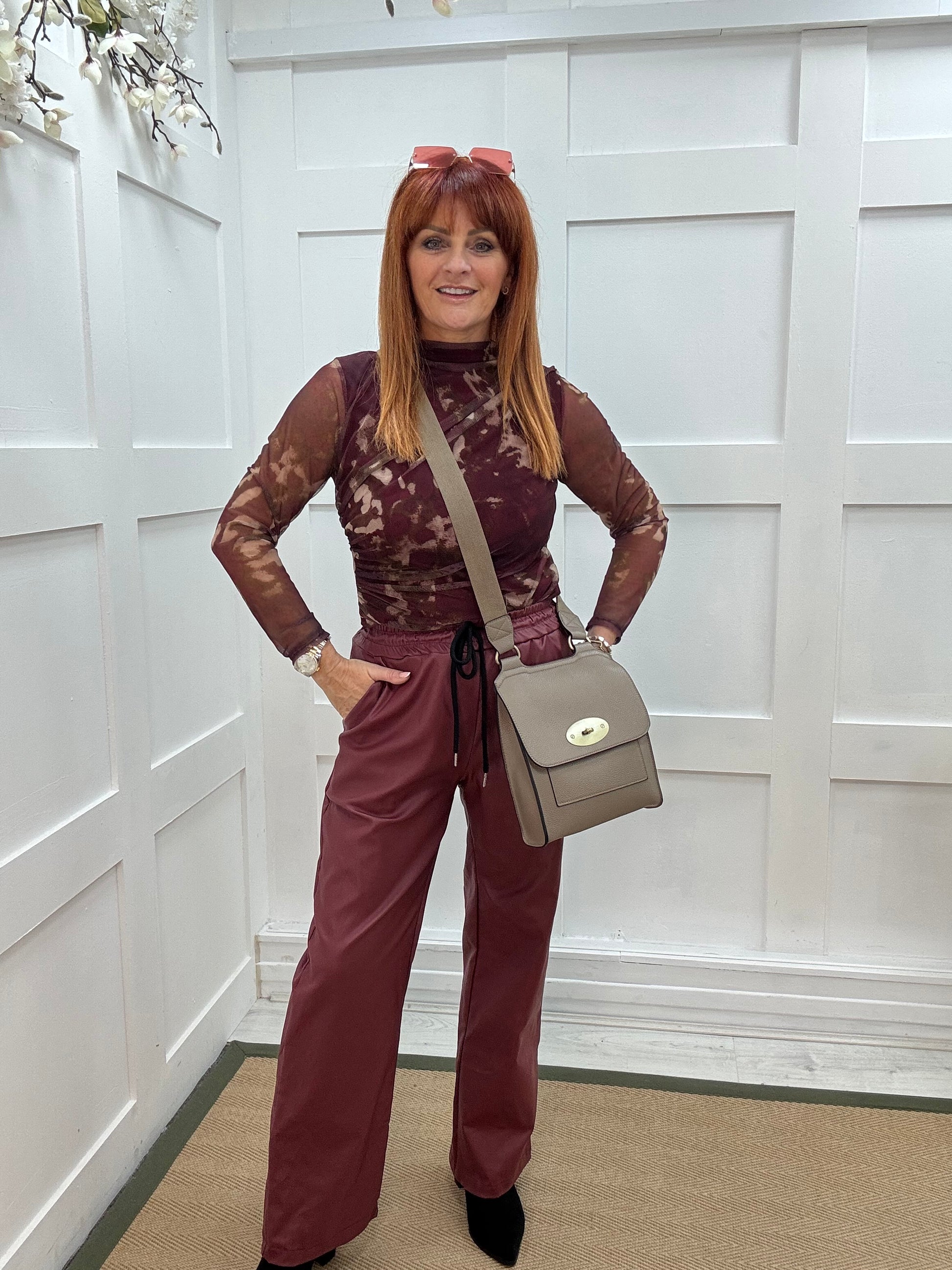 Maya: Burgundy pattern ruched mesh top. One Sz: 12-18