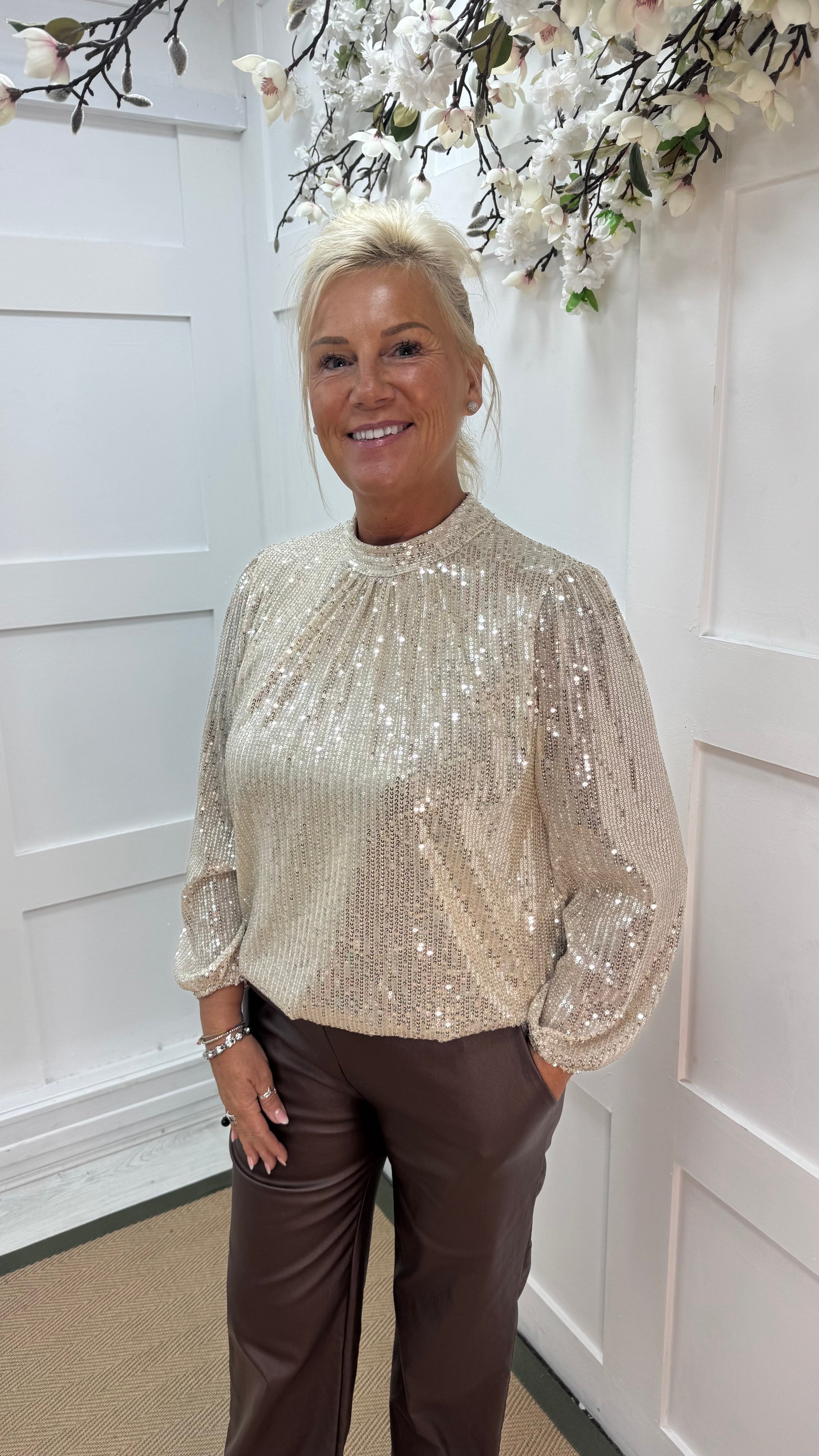 This stunning top is a cream/champagne shade covered in shimmering sequins, adding effortless glamour to any look. It features a flattering high neckline, soft pleating at the front, and full-length sleeves with a relaxed fit. Perfect for party nights or festive occasions, it pairs beautifully with faux leather or tailored pieces.