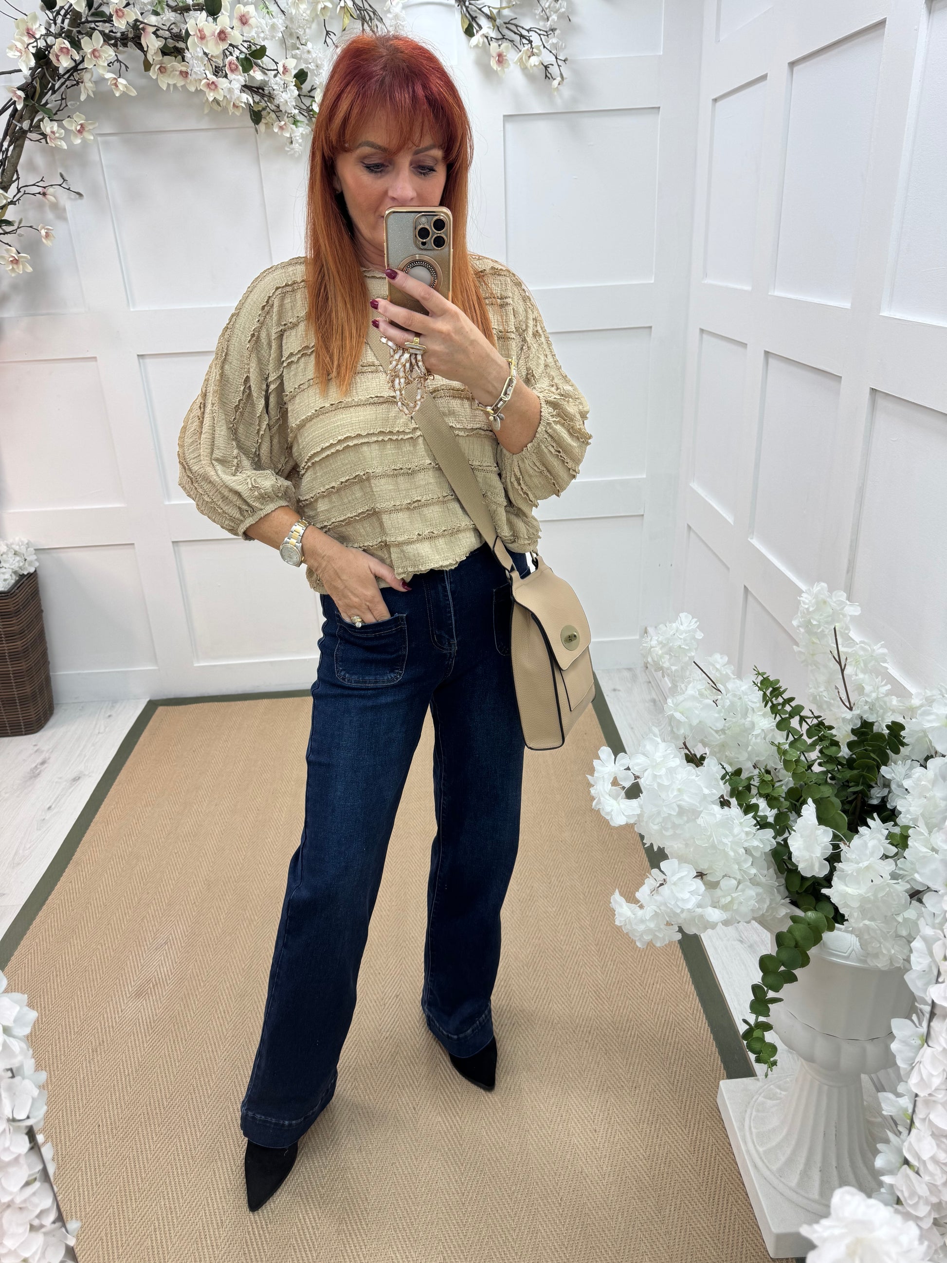Suzie: Mid blue front pocket wide leg jeans. Sizes: 8-16