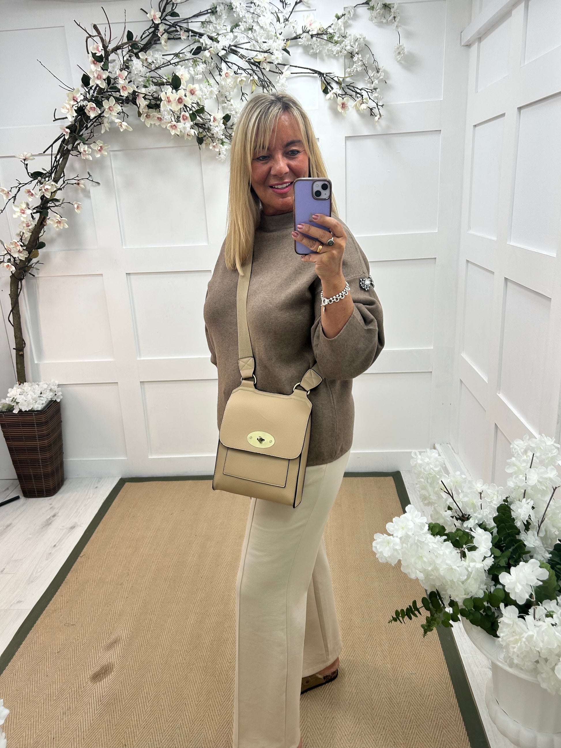 Nikita: Mocha cashmere rhinestone top. One Sz: 12-18