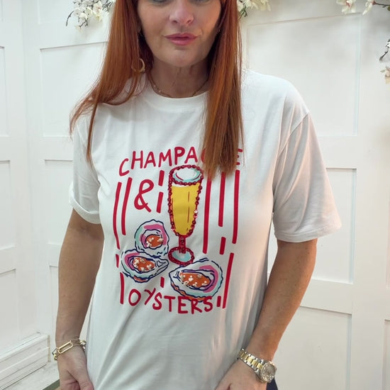 Orla: White & red “champagne & oyster” T shirt. 2 sizes.