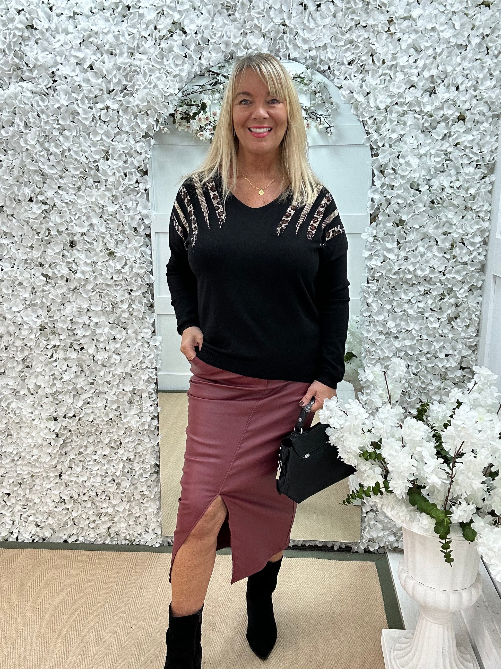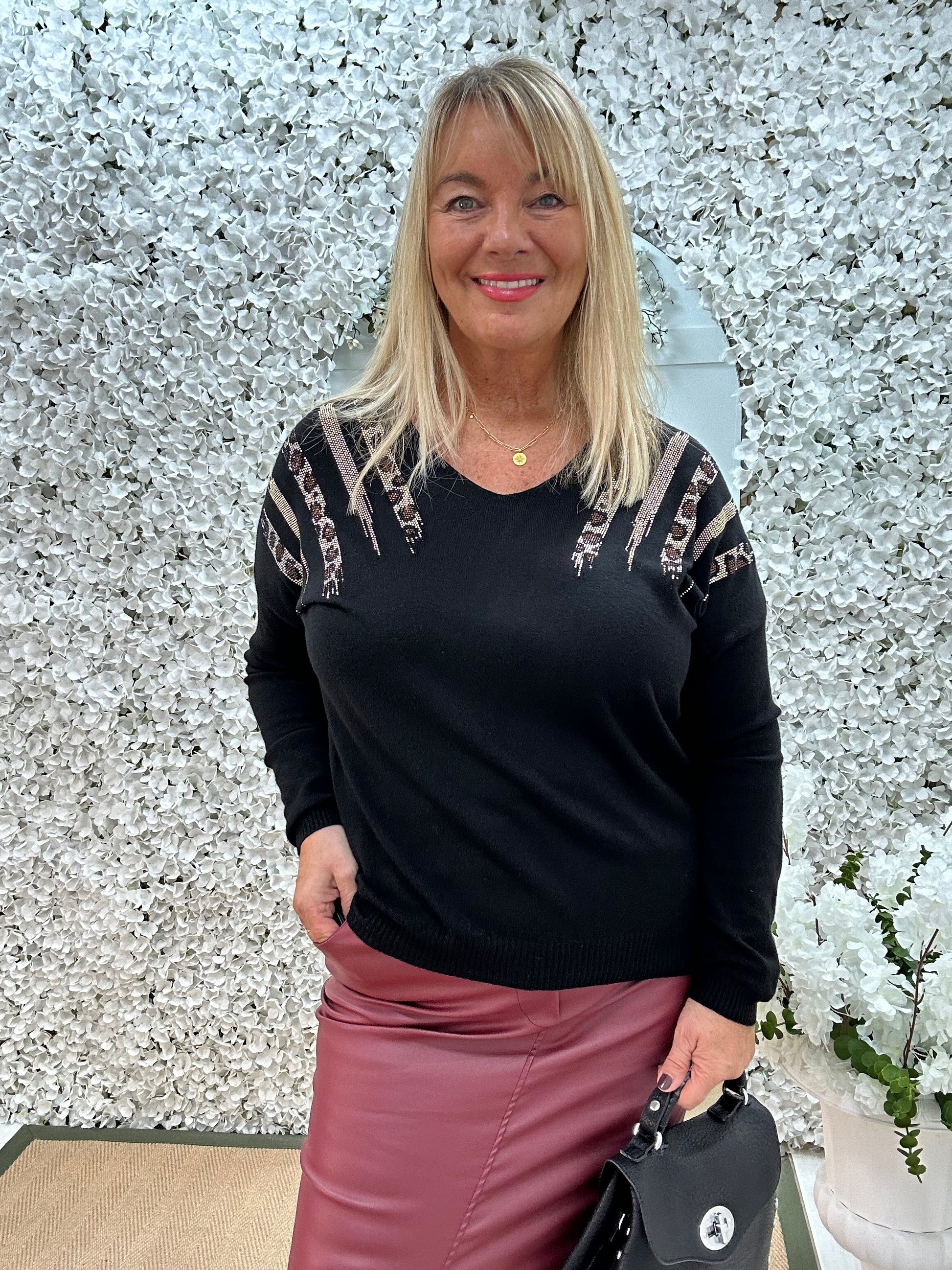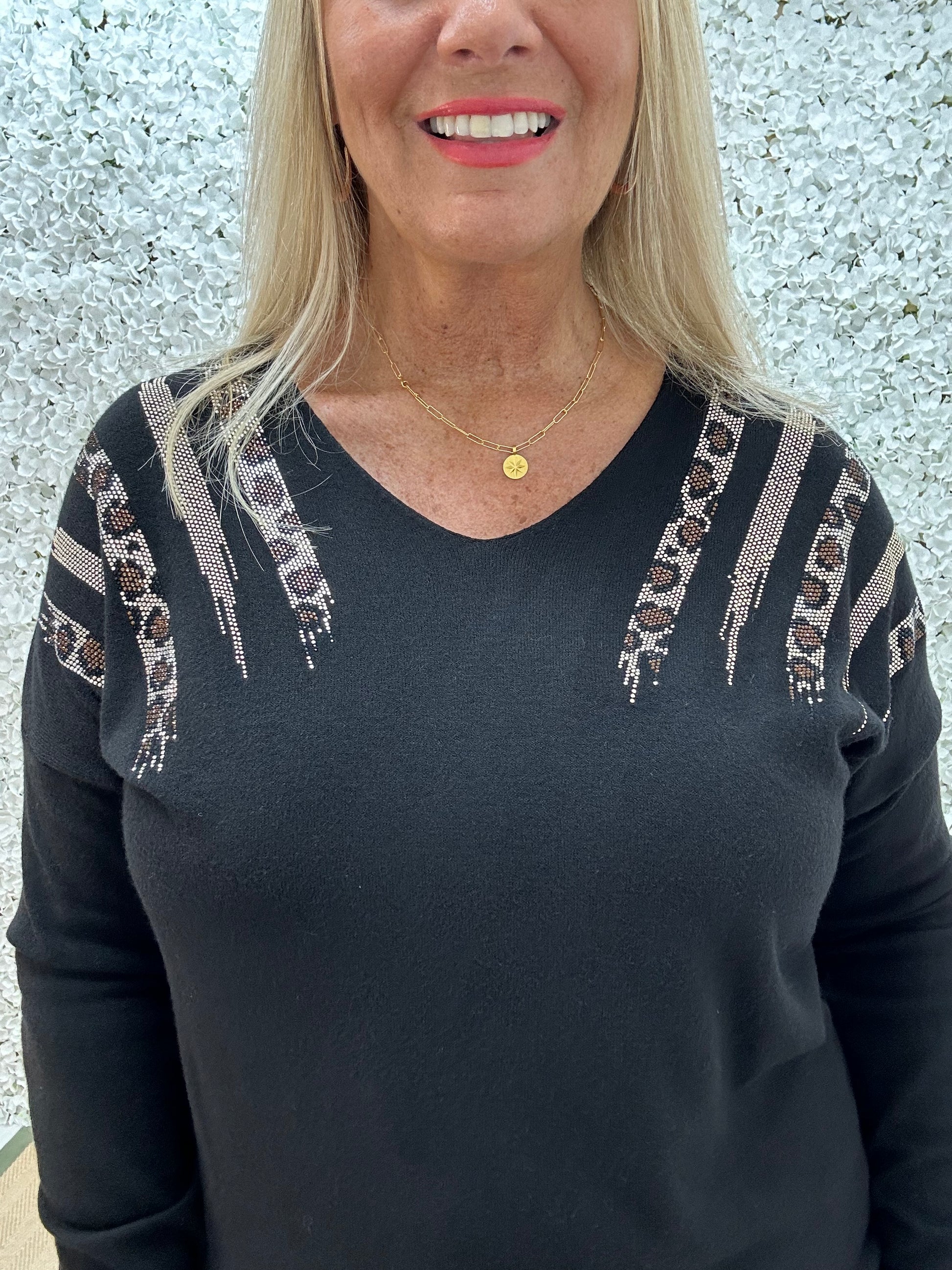 This soft, stretchy top combines comfort with subtle glamour. In a jet black, it features a v-neckline and long sleeves for easy wear. The standout detail is the shimmering embellishment on either shoulder. Effortlessly chic, it transitions from day to evening with ease. Perfect to pair with our Trudy trousers.