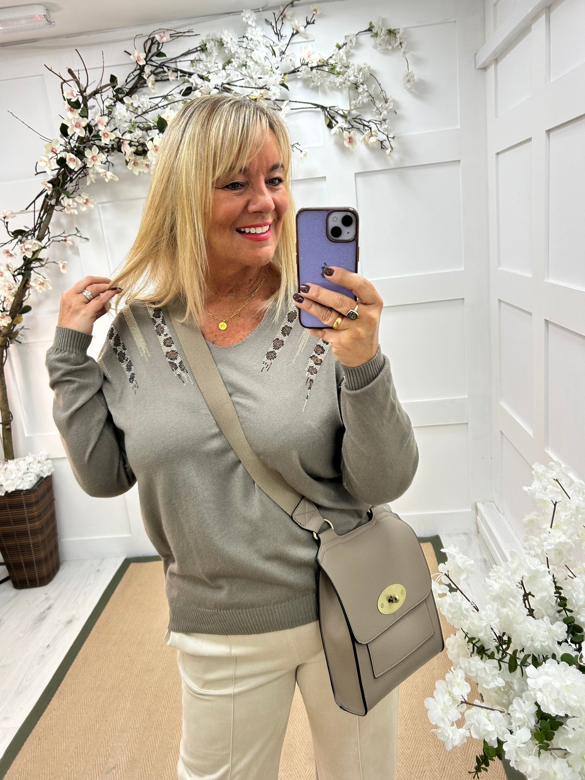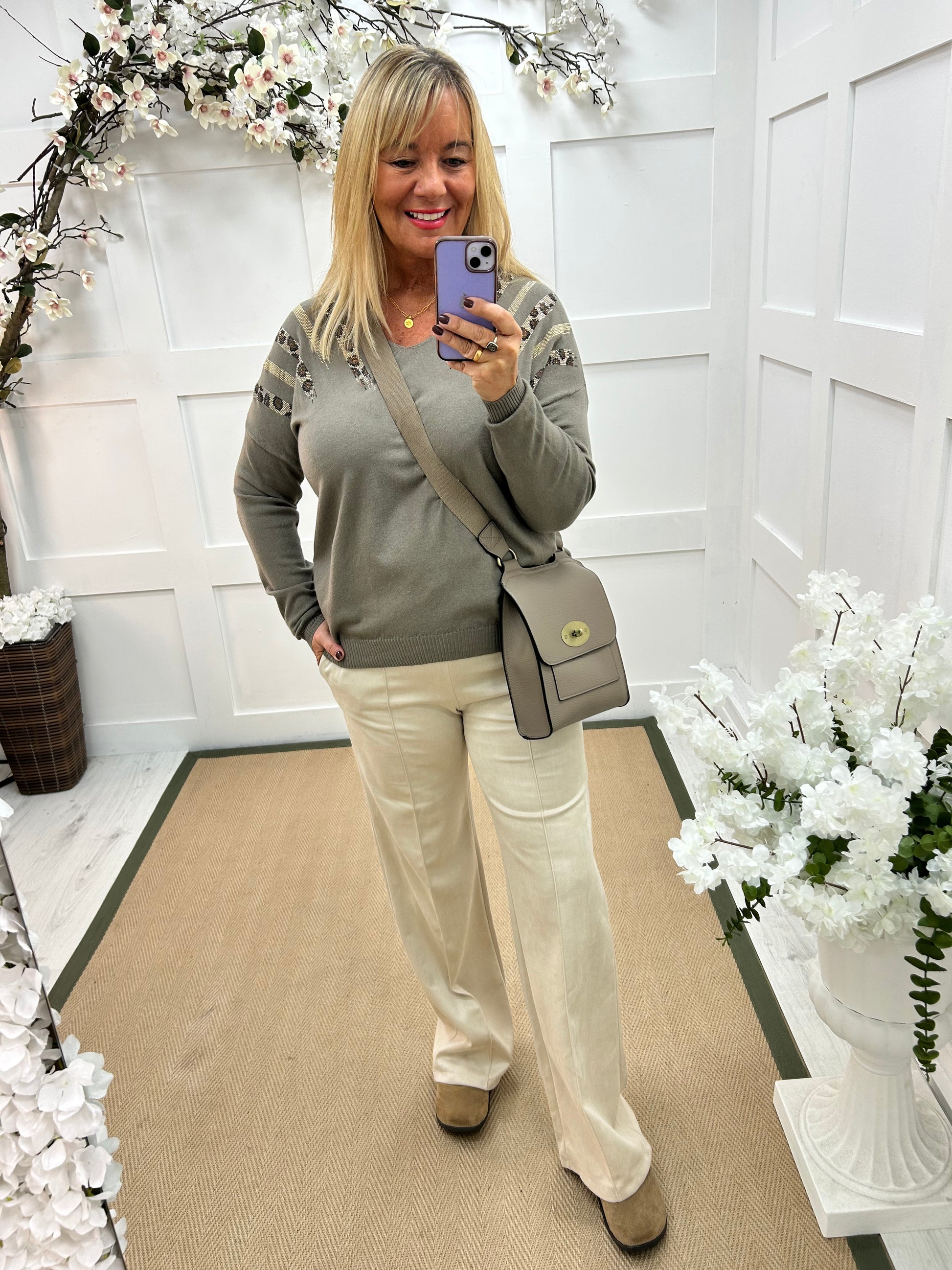 This soft, stretchy top combines comfort with subtle glamour. In a beautiful mocha colour, it features a v-neckline and long sleeves for easy wear. The standout detail is the shimmering embellishment on either shoulder. Effortlessly chic, it transitions from day to evening with ease. Perfect to pair with our Trudy trousers.